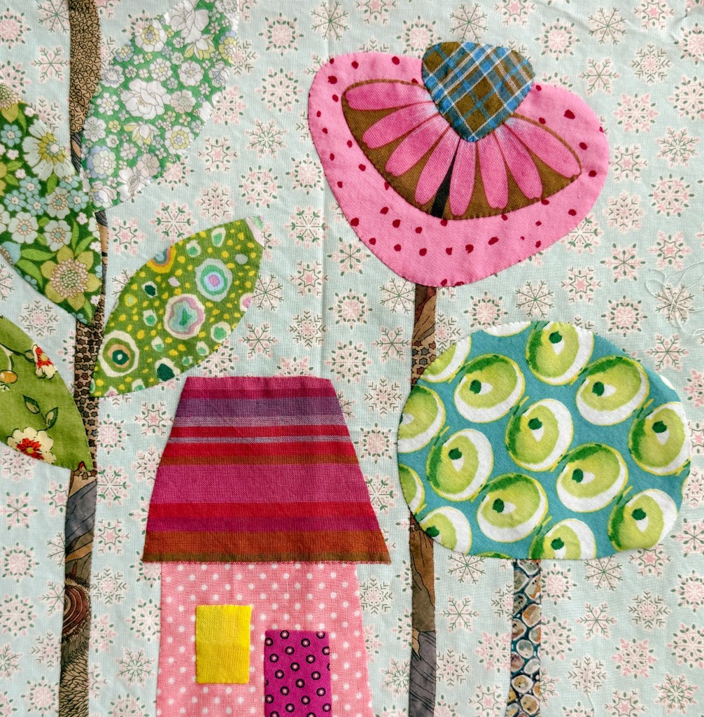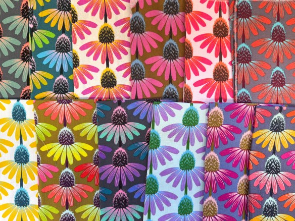 I haven’t pieced with it yet, but I will. I even have a stack of Kaffe stripes that would be perfect with these zinnias—later. When I have time. Right now I’m deep into Buttonwood Village and have already found three perfect places for a flower to sneak in.