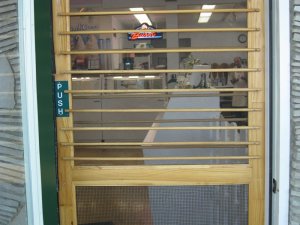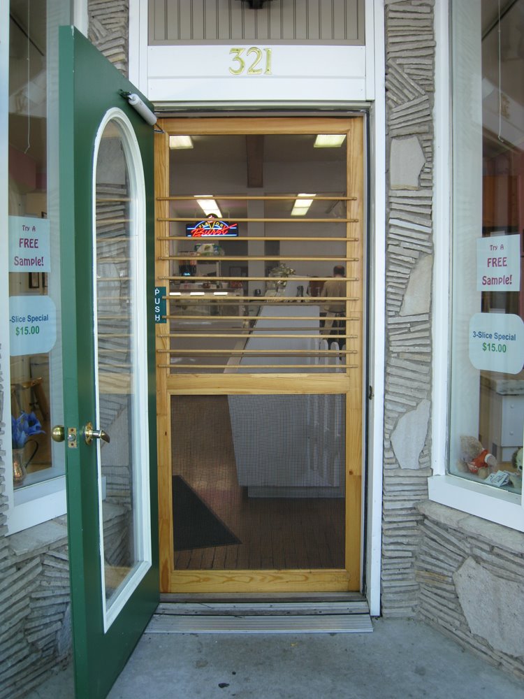I saw this screen door on a bakery in Charlevoix, MI. The owner must have gotten tired of people pushing on the screen to open the door. I know from experience that that can pull the screen loose from the door. So she (or he) screwed dowels across the door to protect the screen. The dowels are odd lengths and not perfectly aligned which adds to their charm.