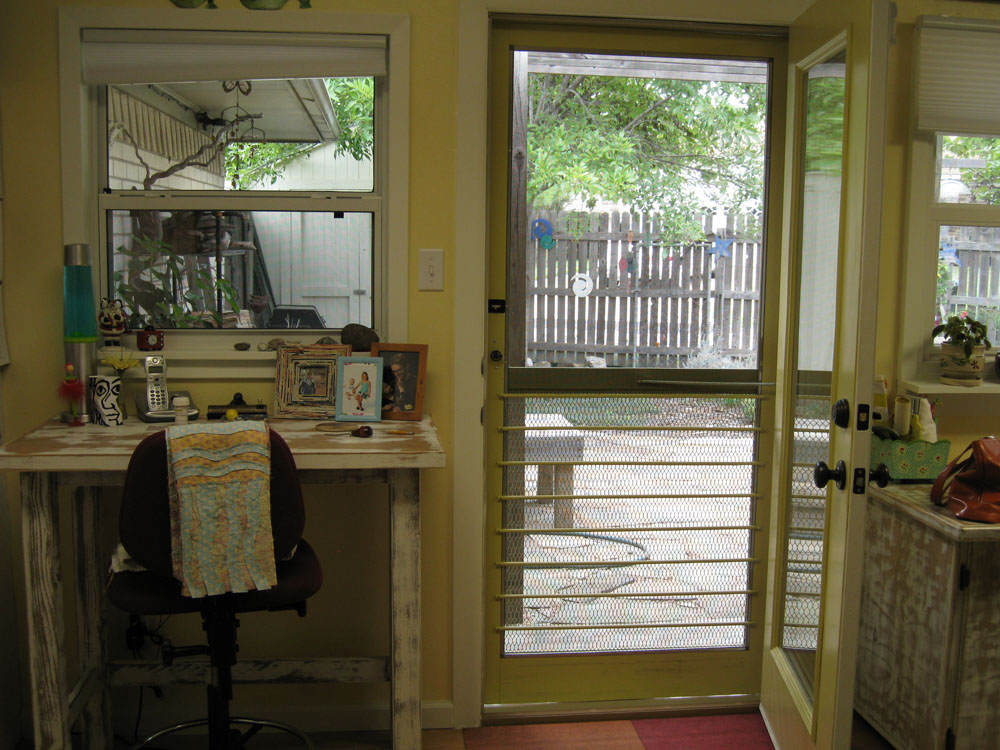 And here you can see the door in place. The dowels are on the inside of the door. They are spaced 4″ apart and I think that will keep the cats from destroying the screen. There’s a big piece of wire mesh on the outside bottom half that will protect the screen on that side. I got the spring on and pulls the door shut with a resounding thwack!