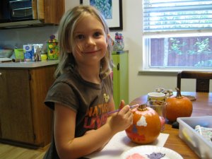 Elanor had me draw outlines for the eyes, nose, and mouth on each pumpkin and then she did all the painting. We used acrylic tube paints (which is what I had on hand). There was some color mixing. She was after scary pumpkins and I think she nailed it!