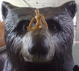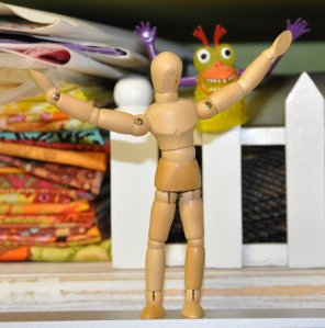 I have this little wooden man action figure that was given to me by my editor and fellow author, Lynn Koolish. (Thanks, Lynn!) Little Man is not really an action figure – he’s a drawing tool and he has been an interesting addition to my desk.