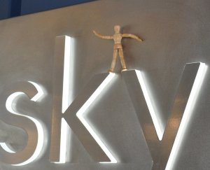 Here he is perched on the Skylink sign at DFW. Skylink is the people mover at the airport.