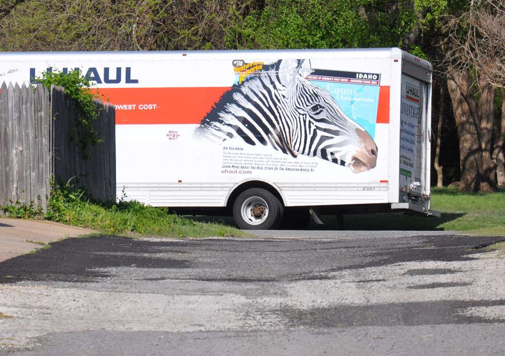 The zebra UHaul parked at the end of our alley caught my eye. In studying the photo I think what makes it more interesting is the pattern in the asphalt in front of it.