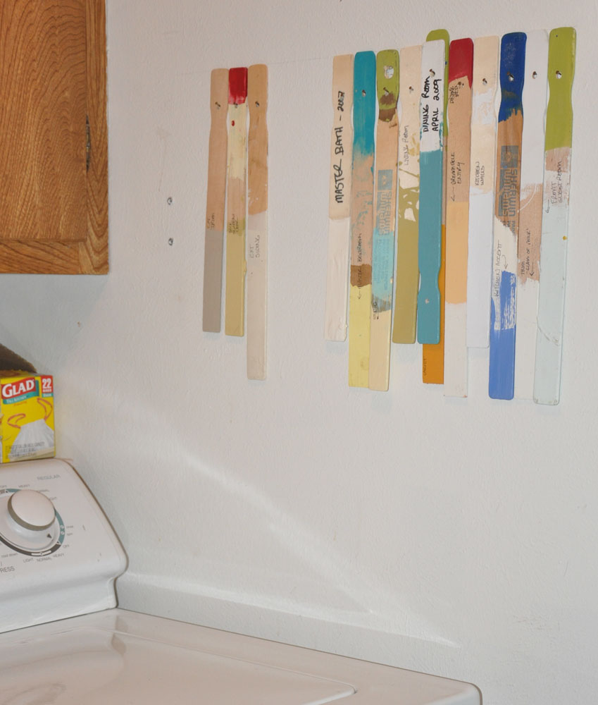 I drew a light, level pencil line on the wall in my utility room. I drilled a hole in the end of the stirrers with current paint colors. I wrote pertinent info on each stirrer and hung them with small nails. It’s nice to see them all lined up as time I come and go.