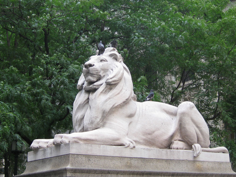 There are lions guarding the entrance to the NYC Public Library. These guys are resting where the ones in front of the Art Institute of Chicago are in mid-step… but they are about the same size. Notice the pigeon on this fellow’s head.