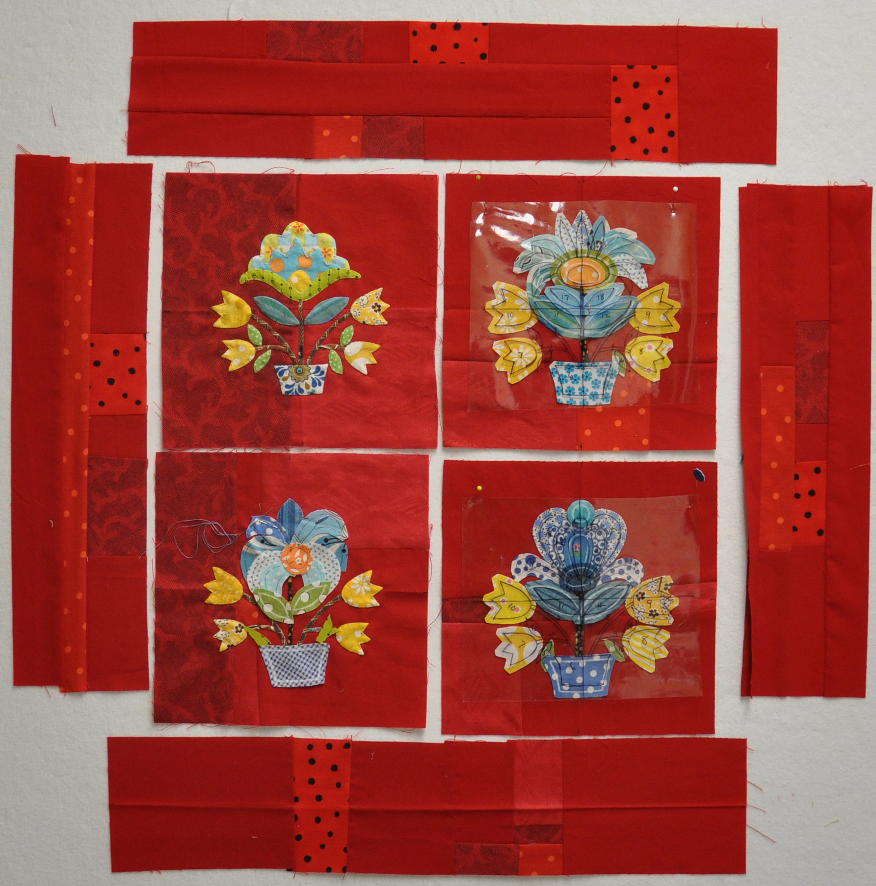 You can see the the sashing and inner borders that I think I'll be using. I'm doing my best to make this mini quilt look as much like it's full-size cousin as I can.