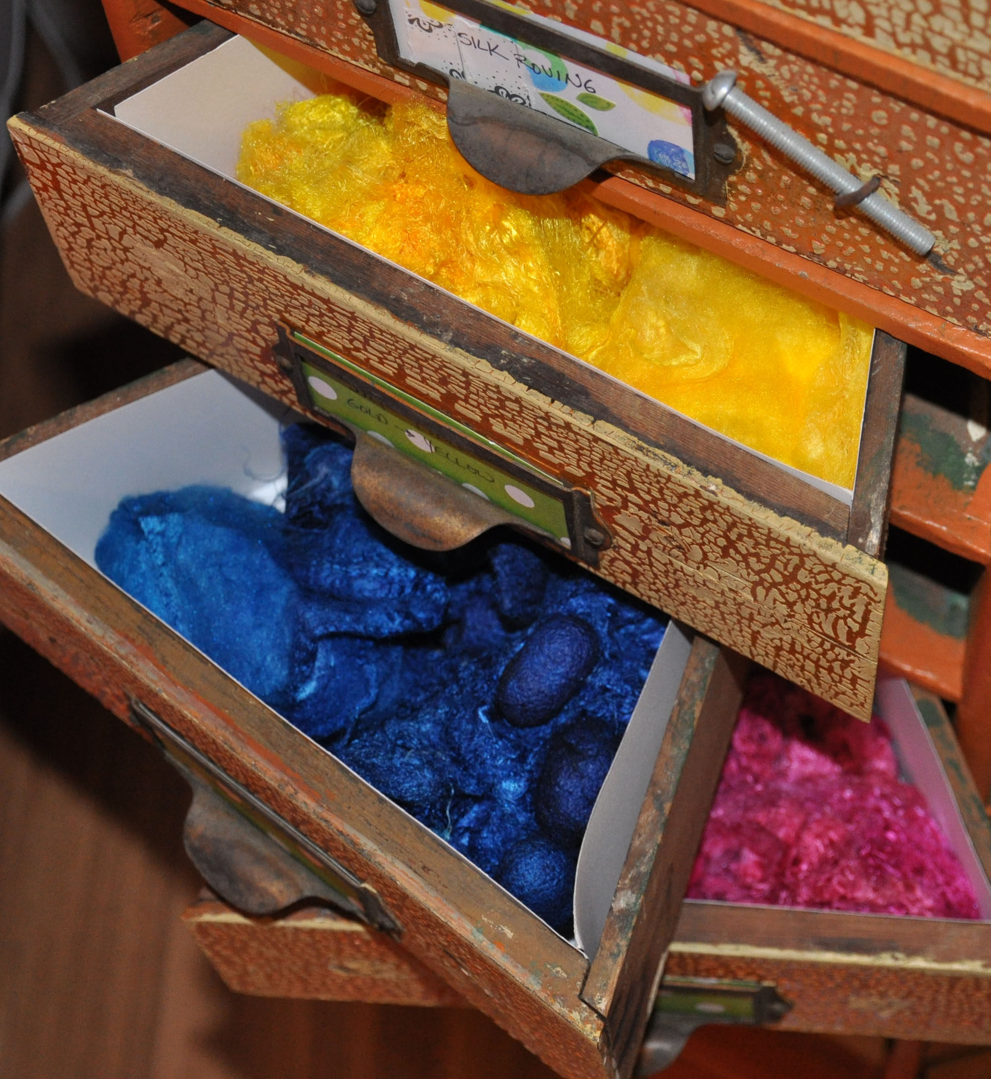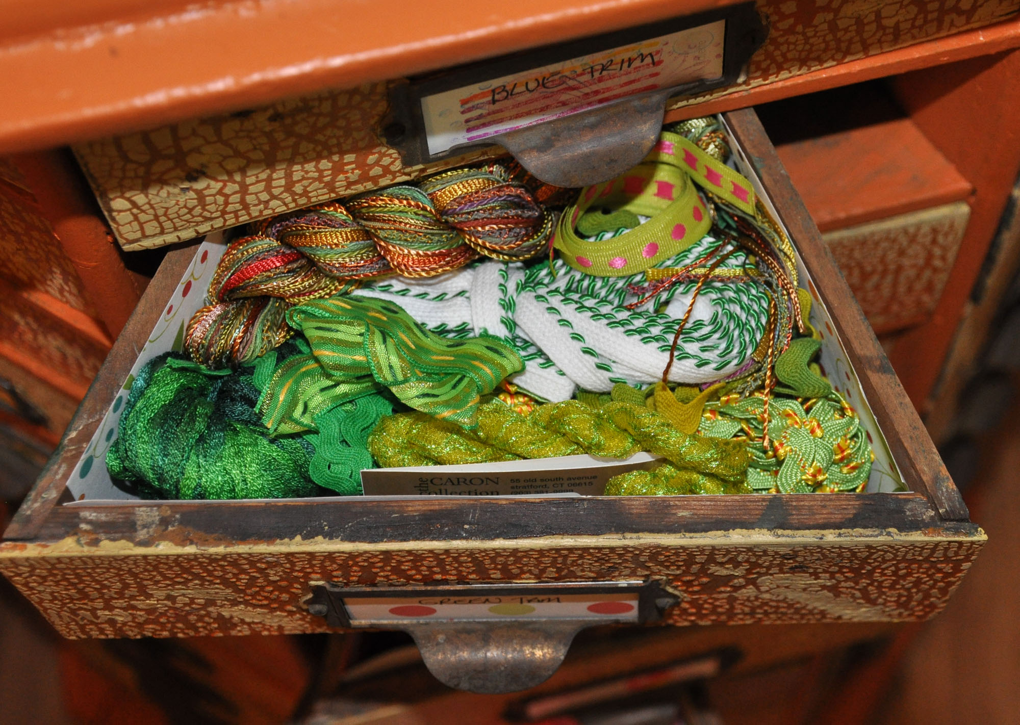 I finally found the time to line the triangular drawers in the parts bin with acid free scrapbooking paper. Once lined, I filled the drawers with all sorts of fun stuff – silk bits, beads, sequins, crafting tools… the list is very long. I labeled the drawers with colorful paper, in my own less-than-perfect