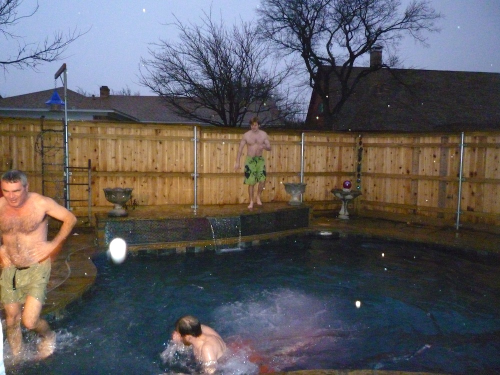 Last night the pool was inaugurated! Steve, Chris, and Jeff jumped in.