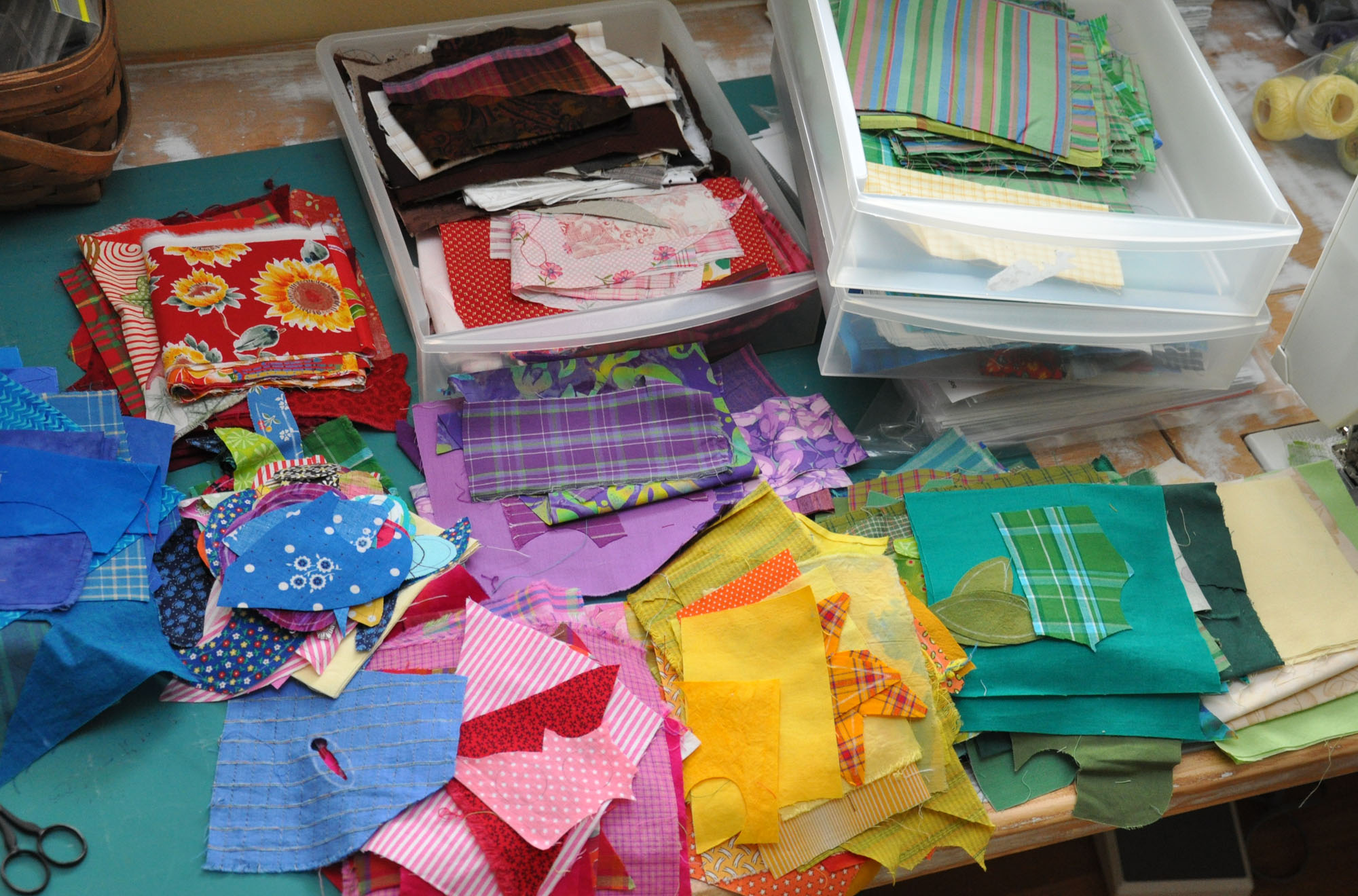 I decided that I would choose the applique fabrics for this quilt from my 3 little drawers of scraps – rather than carefully choosing the fabric from my stash. I began by sorting the various bits into their color families.