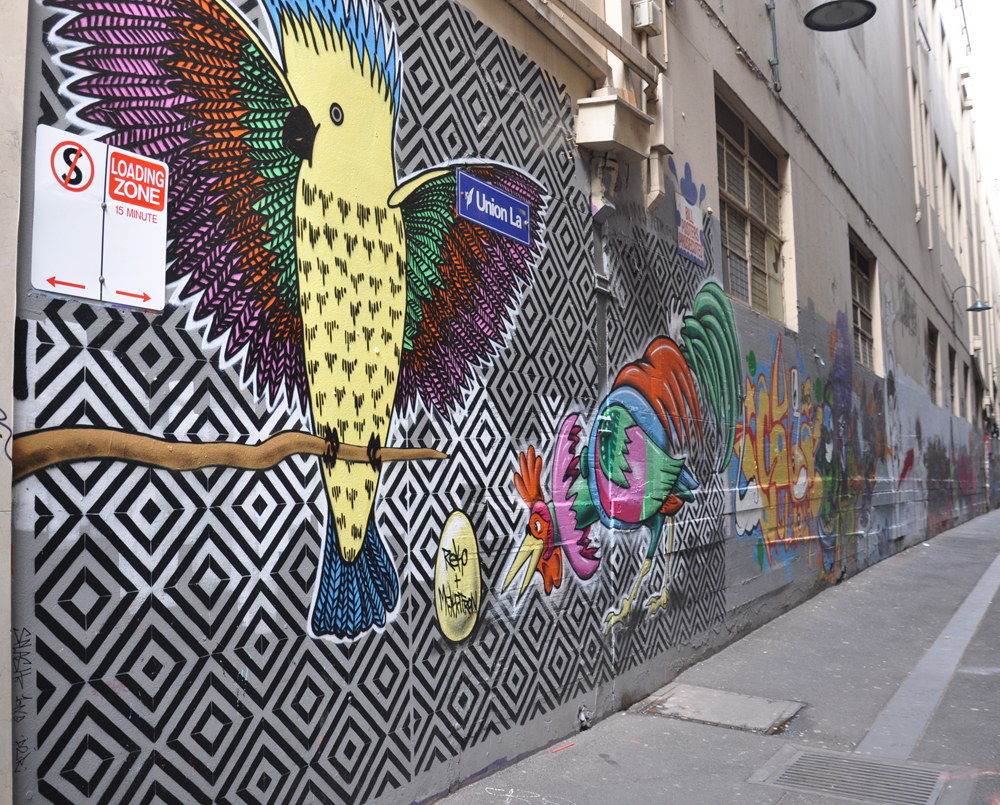 We walked Melbourne for 2 more days, with the smaller camera. Didn't take as many photos but we had a marvelous time! And we ate (and ate) well. There are an amazing number of small restaurants here. The painted column, below, is from the restaurant near the hotel where we ate breakfast every morning. Cafe Domain has the best porridge (oatmeal) and multi-grain toast I have ever eaten.