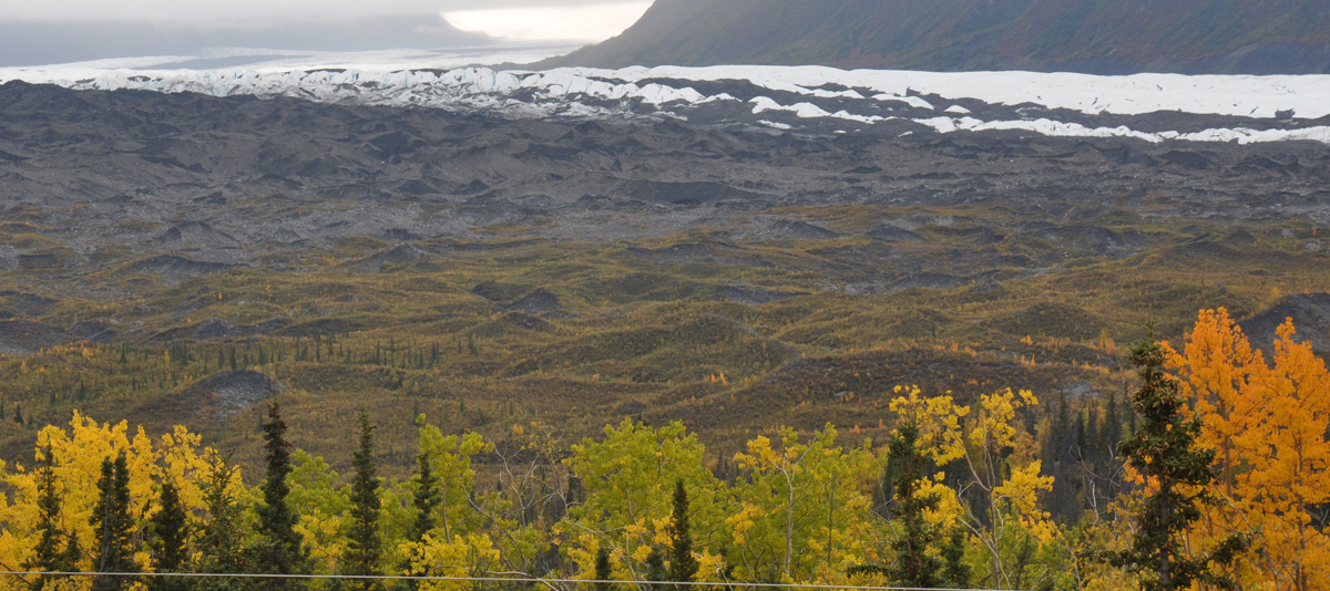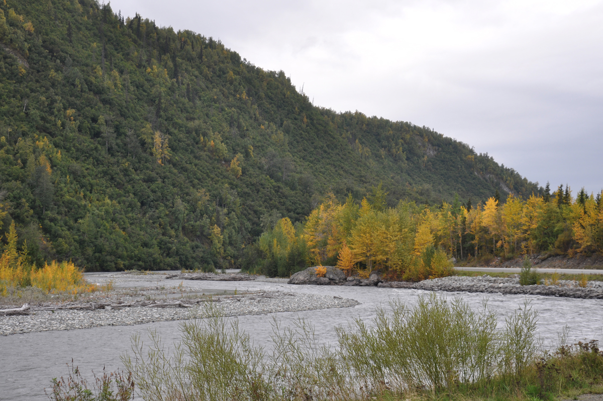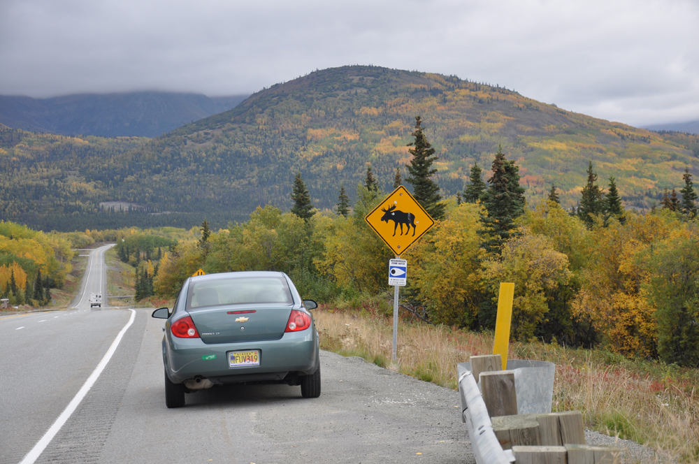 The leaves are turning in Alaska and the scenery was beautiful! I stopped often to take photos (the drive back should be faster). This is my little car next to the elk crossing sign. If you look closely you may notice that the sign has been shot. It's a problem here – most of the signs I saw had been shot. I tried not to think about who might actively be shooting signs while I was on the road.