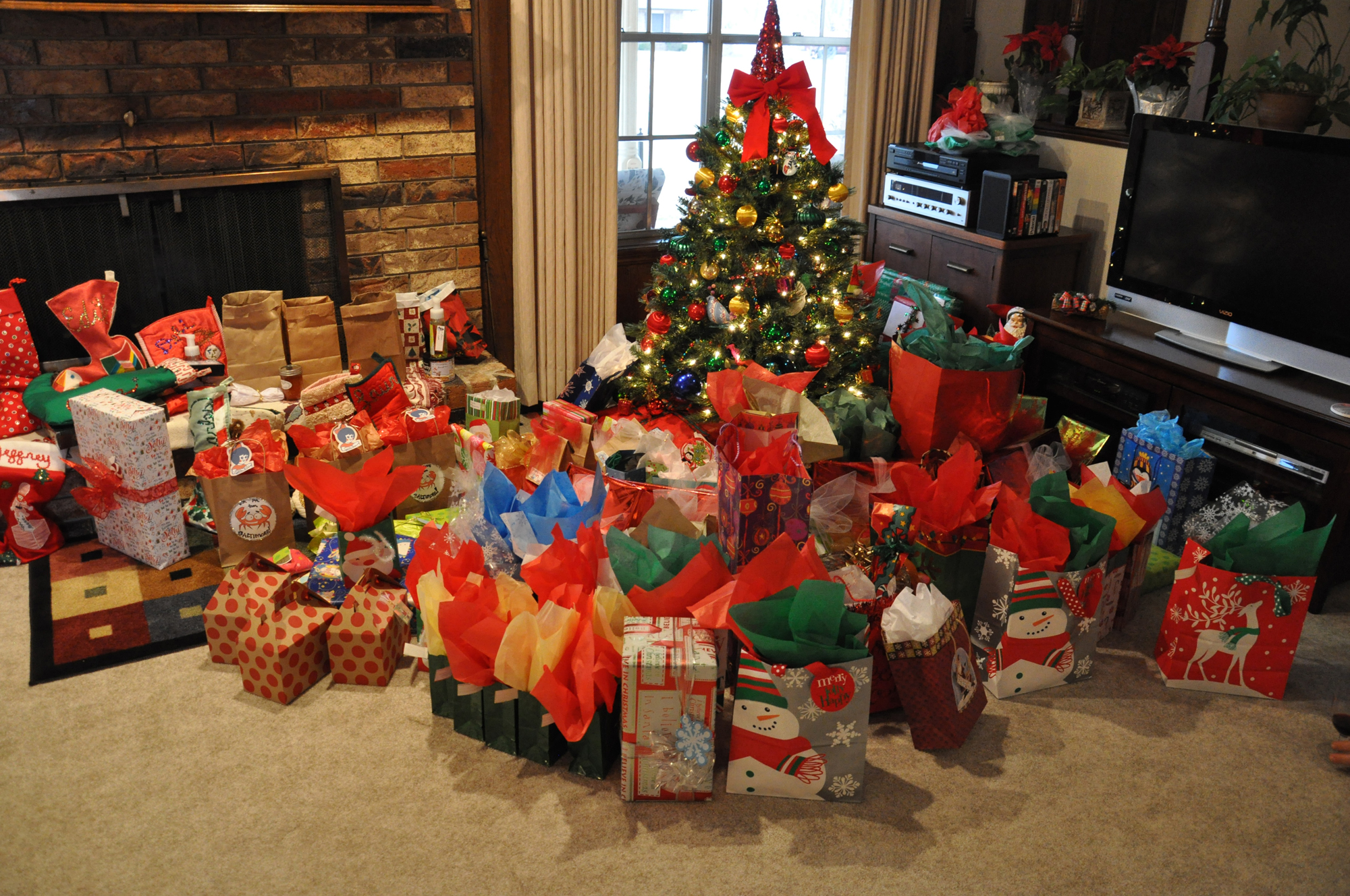 On Christmas day around lunch time they (with wives and children in tow) drive north to Steve's mom and dad's house for the big dinner and festivities. It's not just our family but Steve's brother and sister's families too. The house is full to the brim and the presents take over the living room!