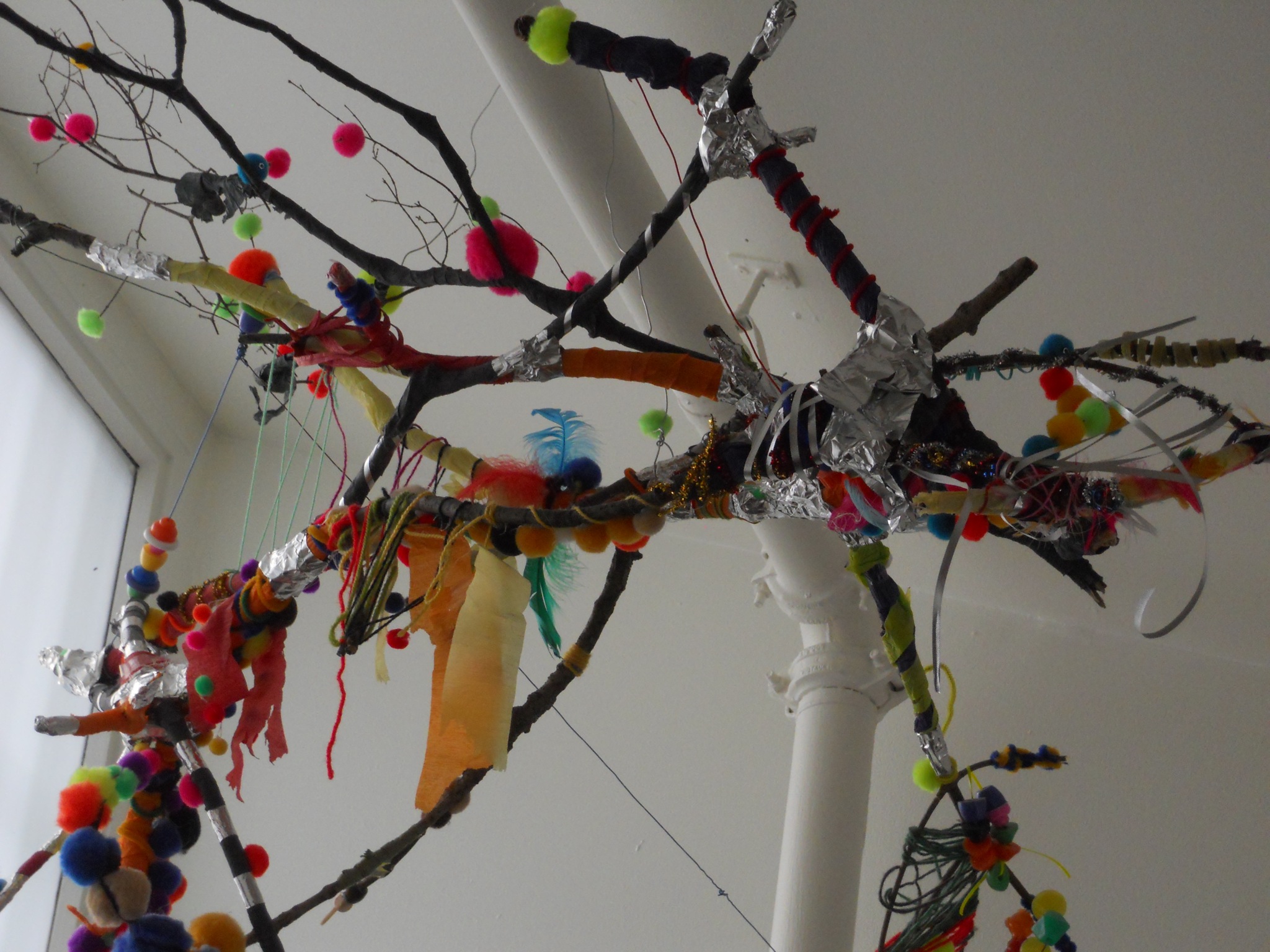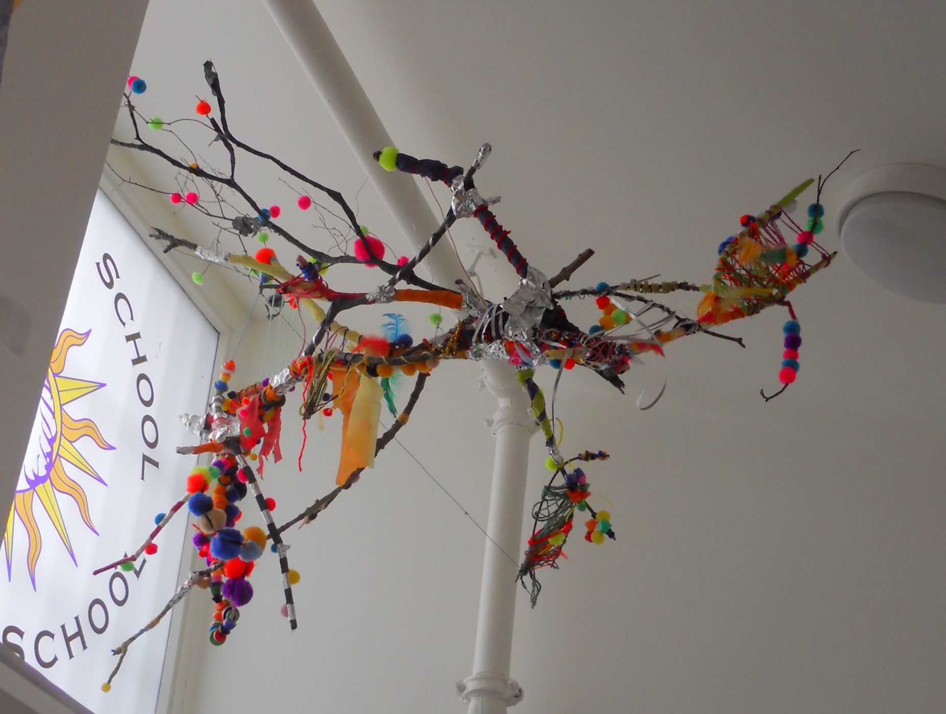 Today’s class was in a wonderful elementary school, one with an emphasis on art. I should remember the name, but I was too focused on class. I took a few photos. There were at least two of these art pieces hung near the ceiling. Look close, they are branches covered with all sorts of colorful stuff.