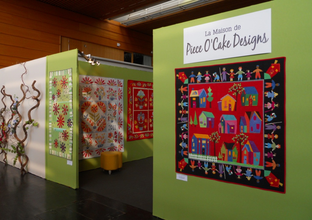 Our “little house” is upstairs. We have a large space and many of our quilts are hanging. Quiltmania chose a lovely green backdrop for our entire space. This is the entrance.