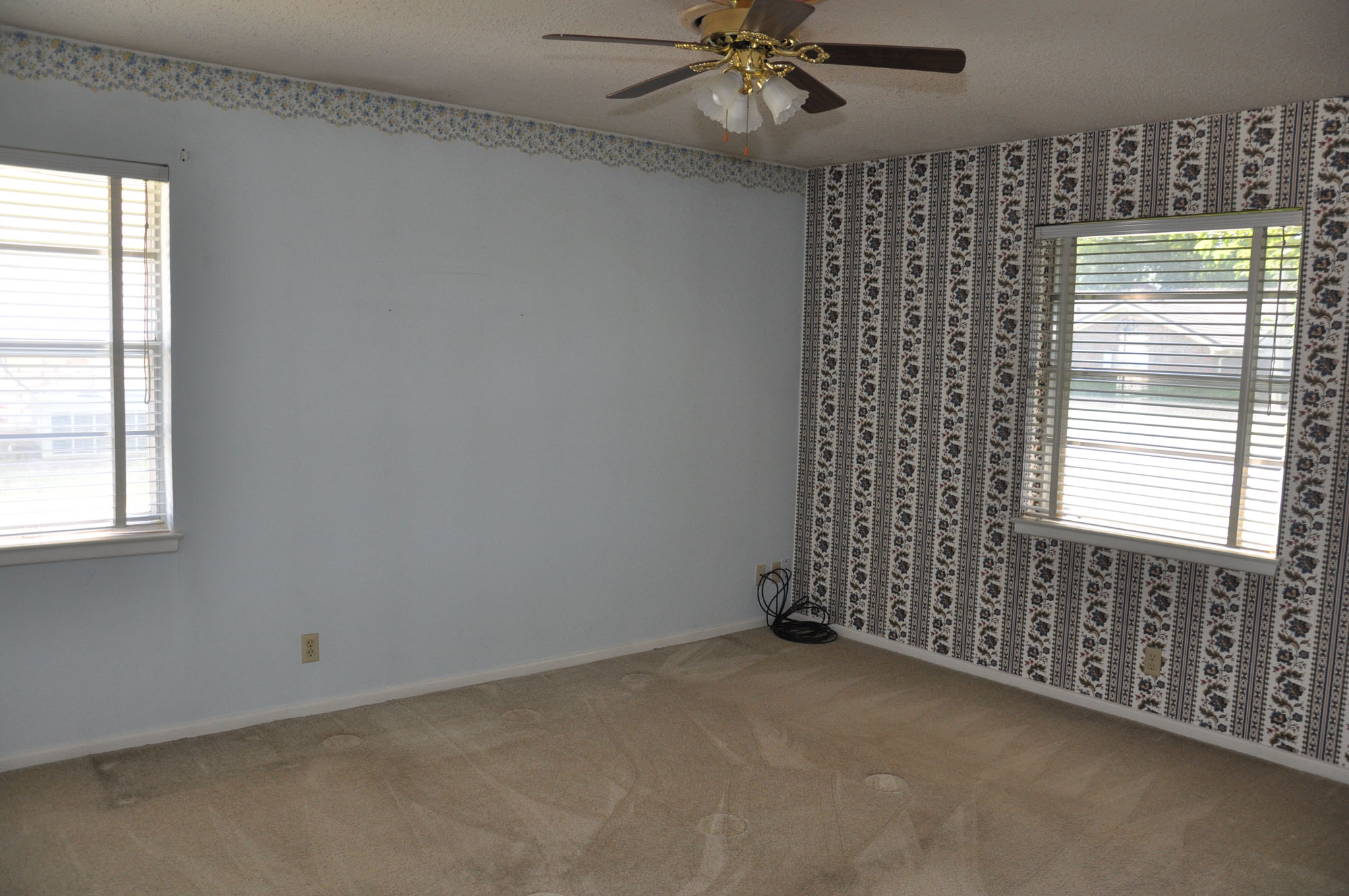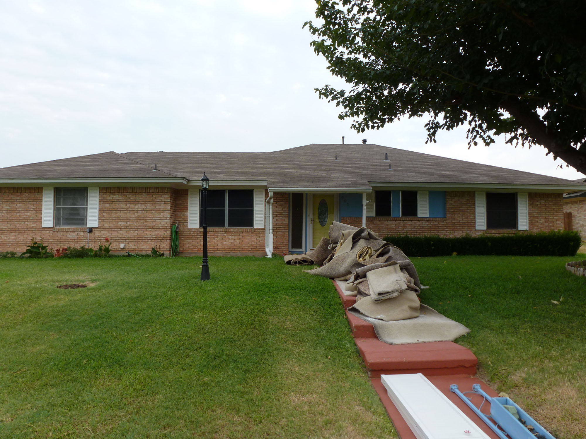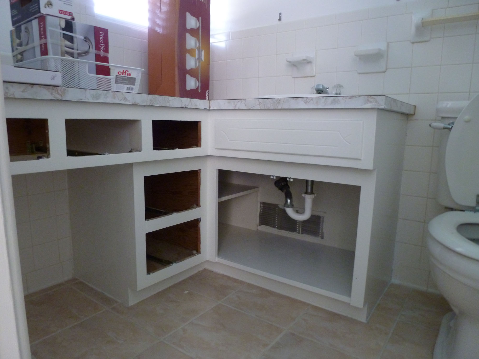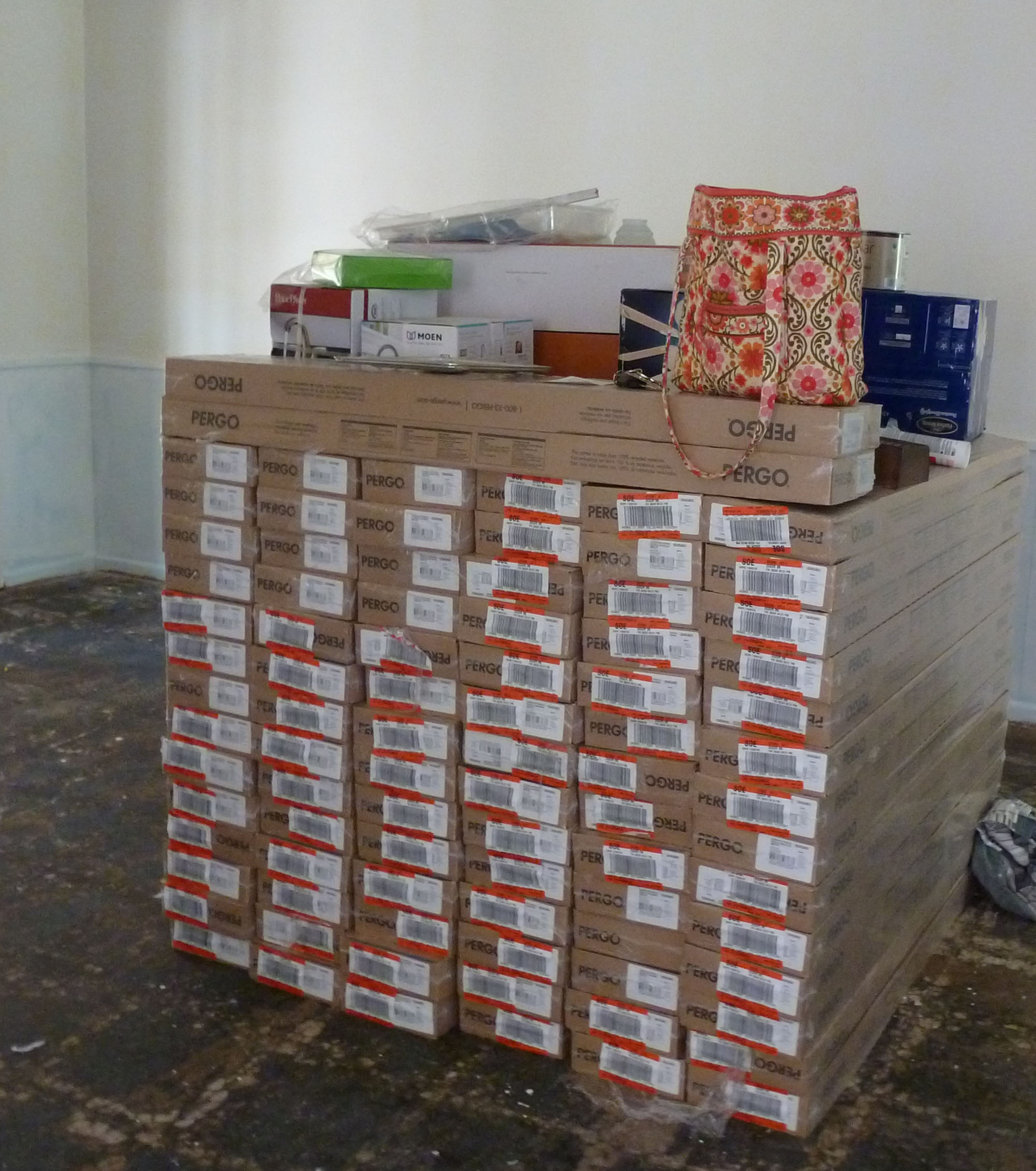 Today it was back to work at mom's house. We set up the paint sprayer and painted cabinet doors (hundreds of them!), louvered doors, and more first thing this morning. Steve had a meeting on campus, I went to Lowe's for supplies, we did some small stuff (got the mirror hung in Christy's bathroom), and after lunch we started laying the flooring.