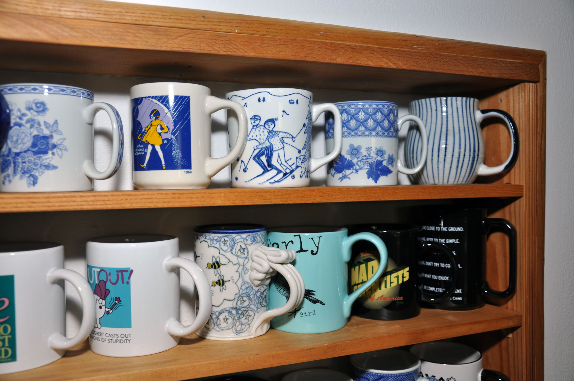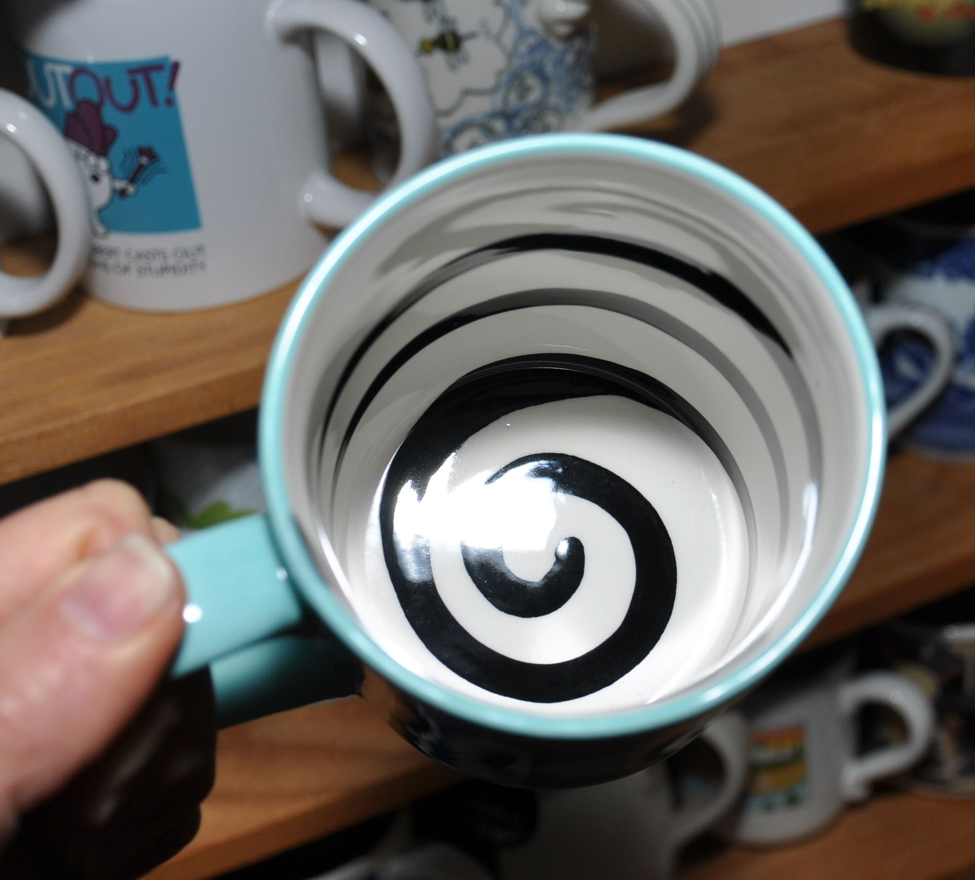 The mug with the skiers is from my childhood. I have two of them – we used to drink hot chocolate from them. Steve's is the mad scientist… the light blue early bird mug is newish and is really fun on the inside…