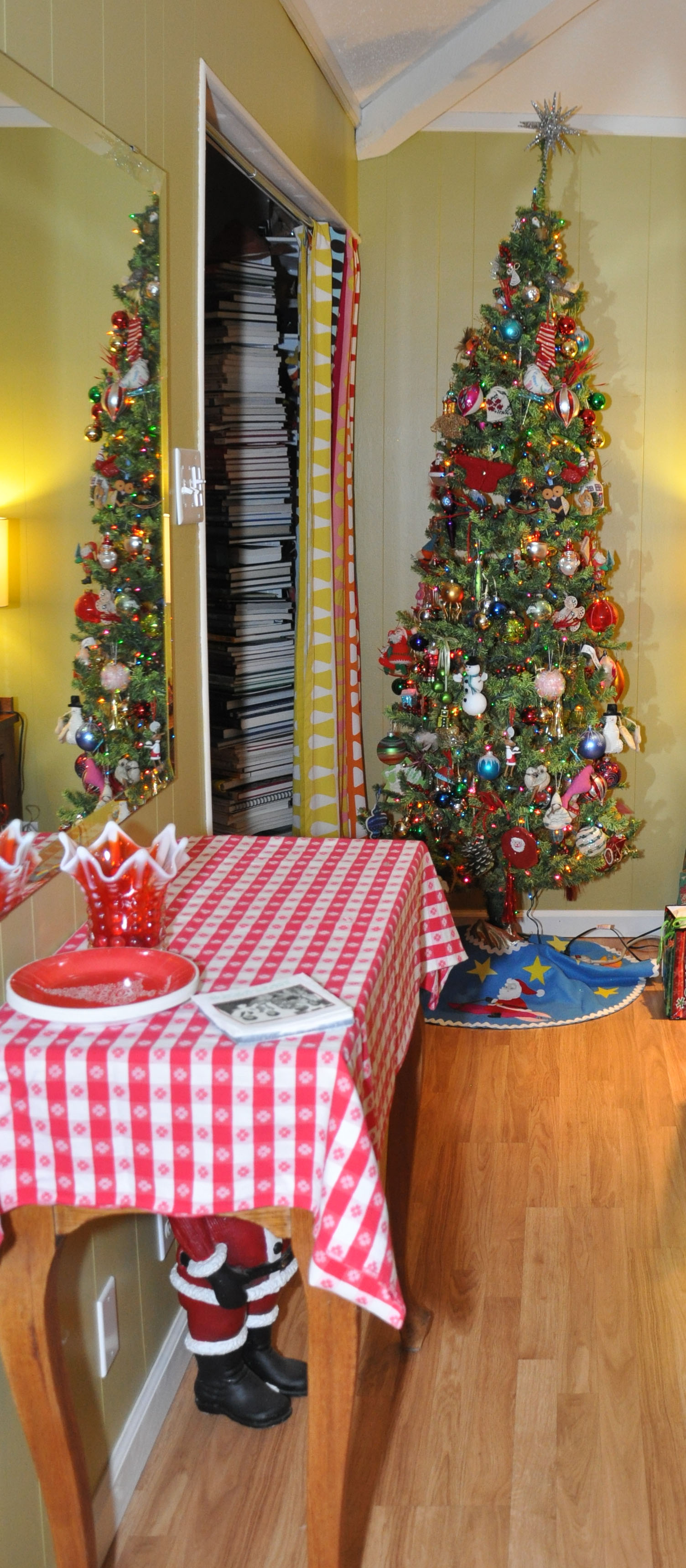 It looks very festive – I love the wrapping paper idea. Is Santa in ‘time out’ under the table??? LOL!