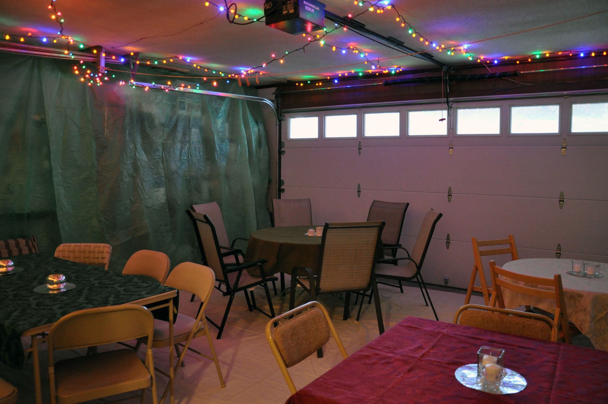 We close up the garage for extra seating. We bought several inexpensive green plastic drop cloths and Steve stapled them to the top of the garage walls. They cover the garage stuff and make the room seem less like a garage. Steve stapled the lights to the ceiling in such a way that we can leave them up until next year.
