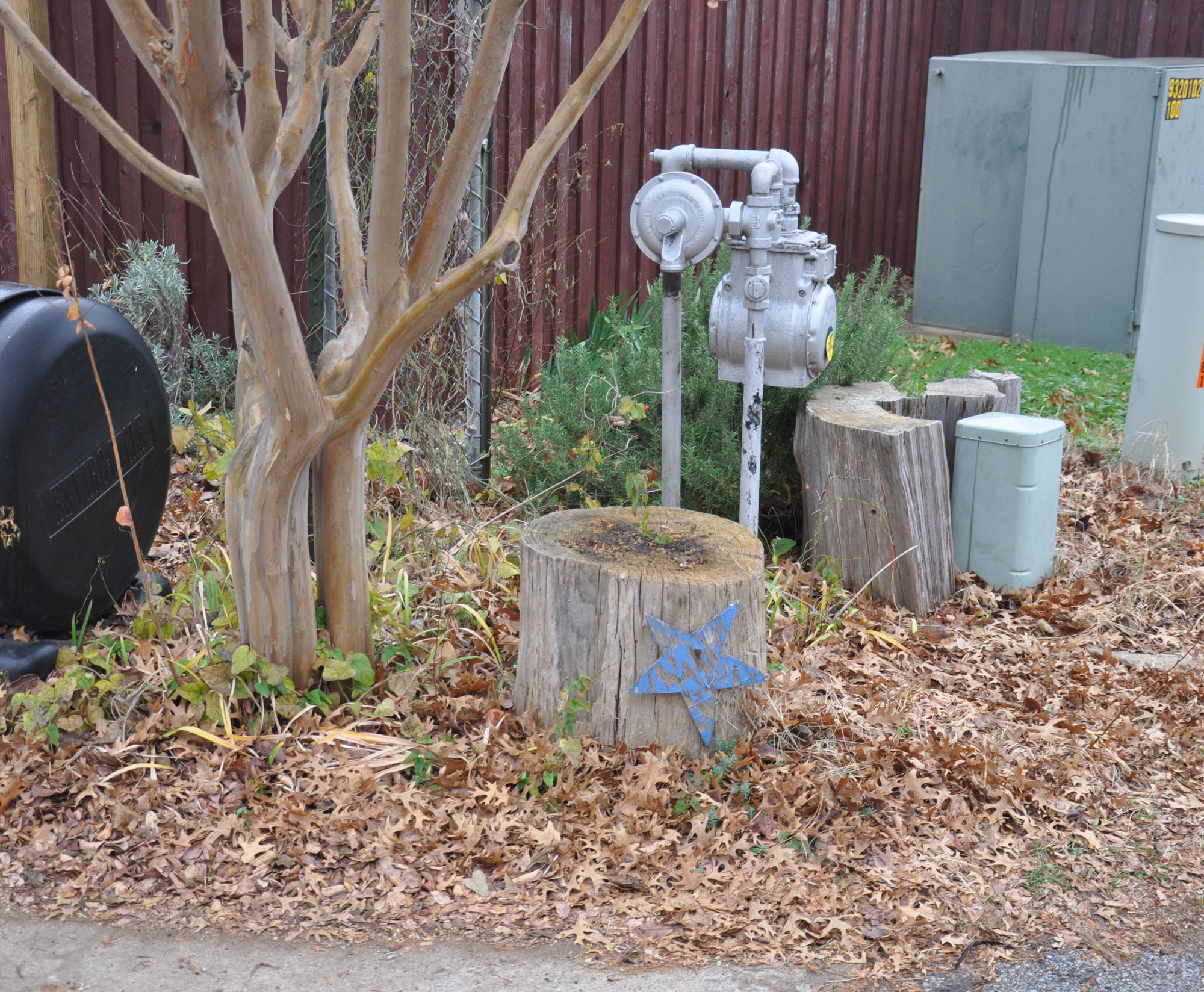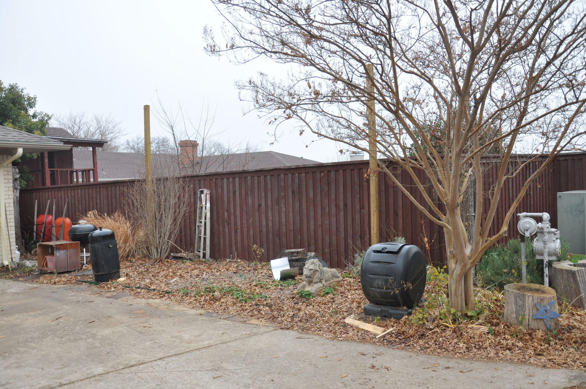Our driveway backs onto an alley. The spot below, next to the alley, is hard to keep tidy. There is this wiry, persistent, obnixious vine that grows here and elsewhere in our yard. You can't really see it here but it had grown all over that chain link gate, up the crepe myrtle, and into and through the rosemary.
