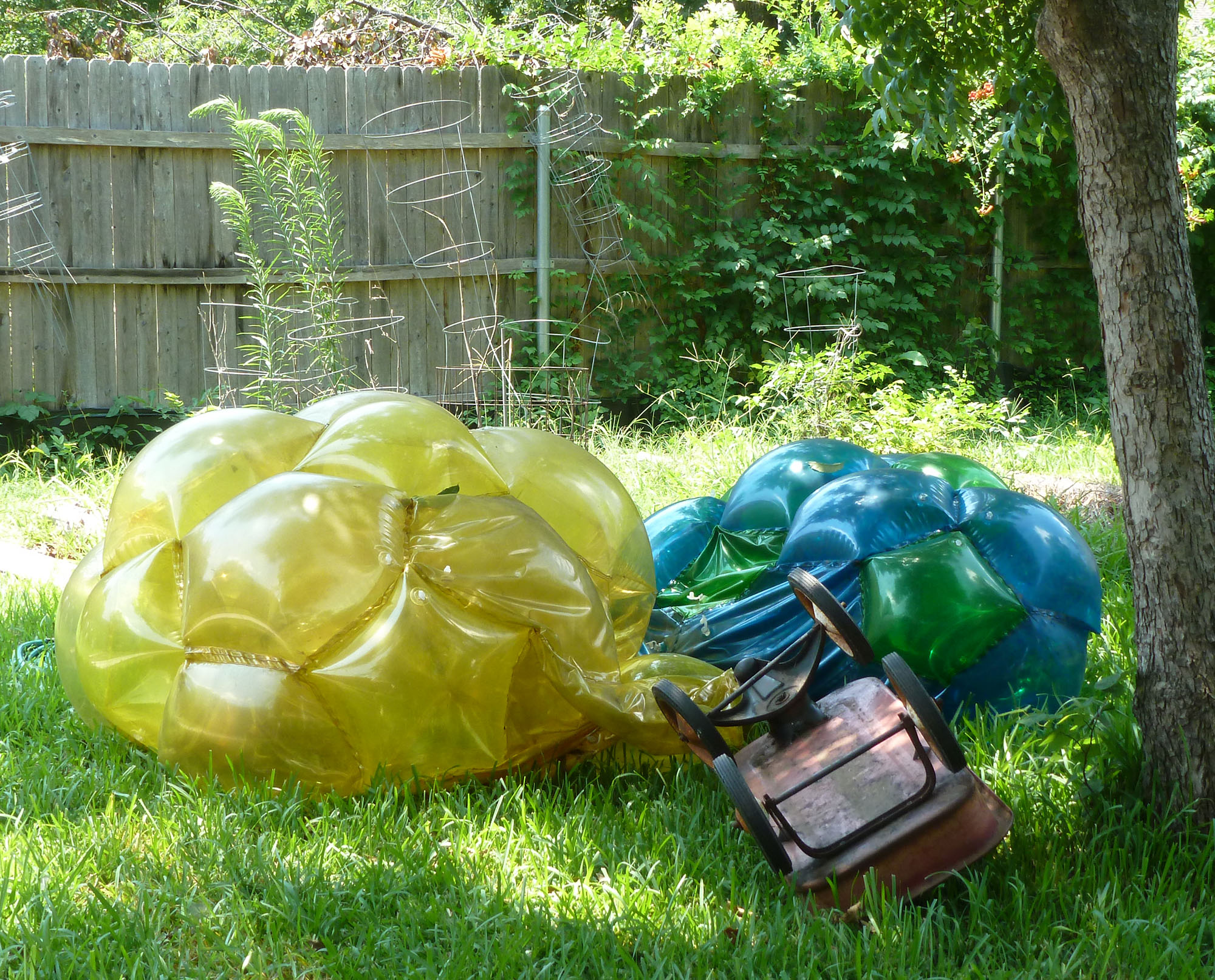 They are big inflatable balls that have a space inside that a kid can get in and be rolled around. Really, it's kind of neat. Lorna's parents bought them for the kids a while back. Now to the down-side. Each inflatable section is separate. It takes forever to blow them up and more than forever to deflate them. These things have been sort of abandoned in the back yard for months. The aphids dropped dew (lots of it) on them. They got dirty. They got wet and then mosquitos came. I've wanted to kill these balls for 2.5 weeks.