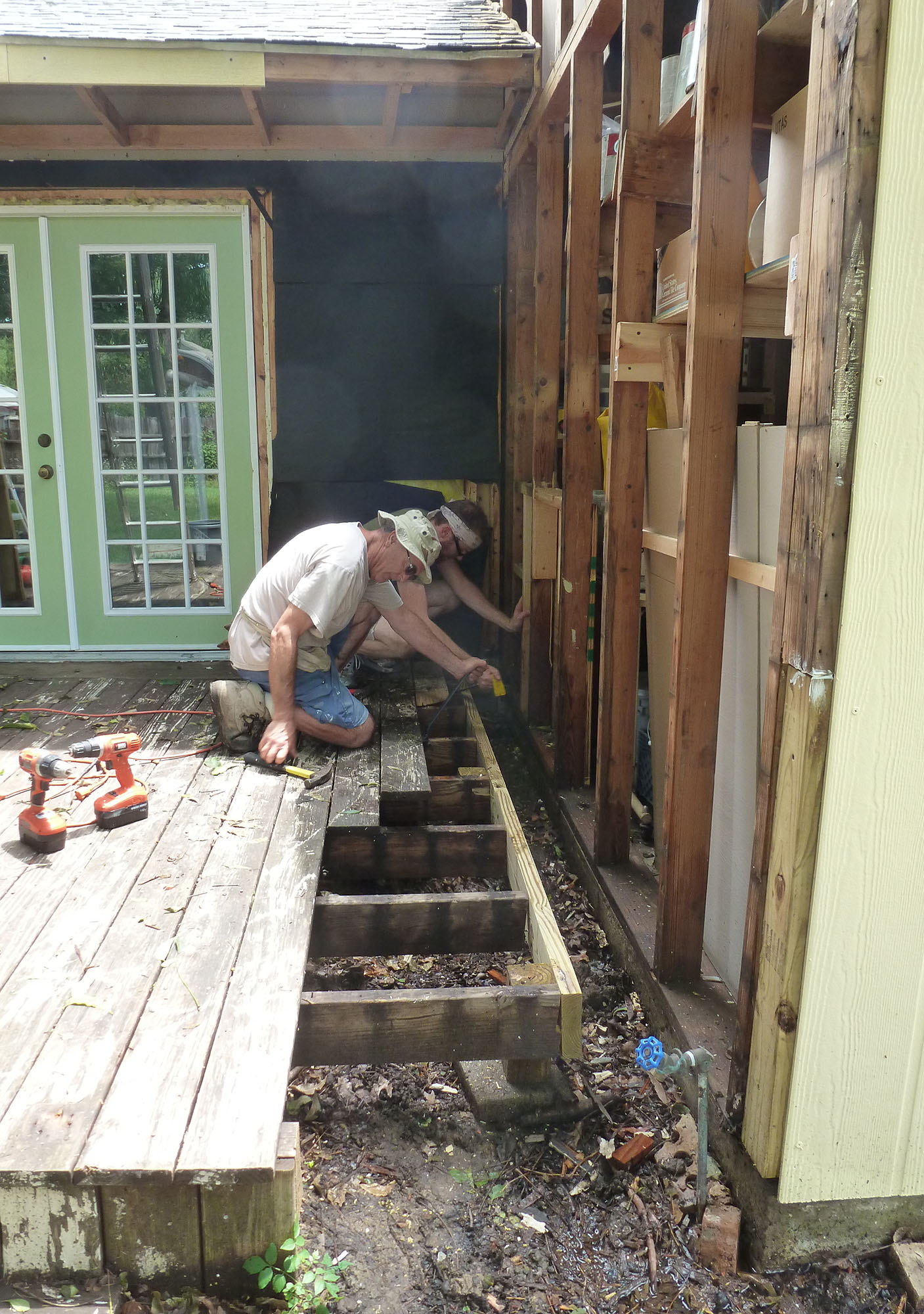 The deck had been attached to the old wood siding on the garage. Not a good thing. It now floats next to the garage. They also got the siding off of this wall all way up to the peak. They also got all of the old siding and facing boards off this (last) wall.