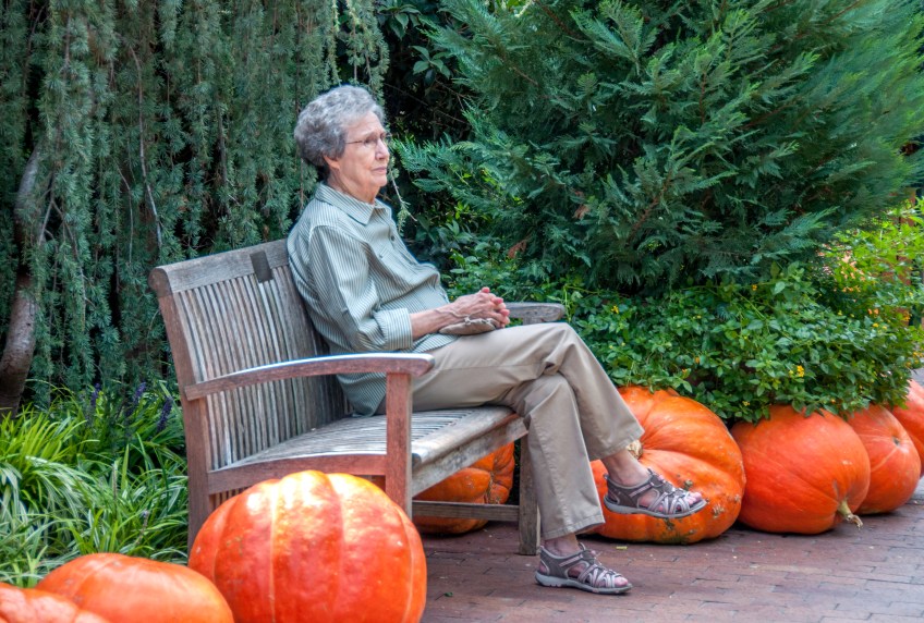 Well Houston, we have a problem. Not one leaf in red, yellow or orange. And colored leaves are Autumn to me. So refocus ….. the zinnia pic says HOT so that is not Autumn either. So I am going with granny (#48) and her sport sandals!