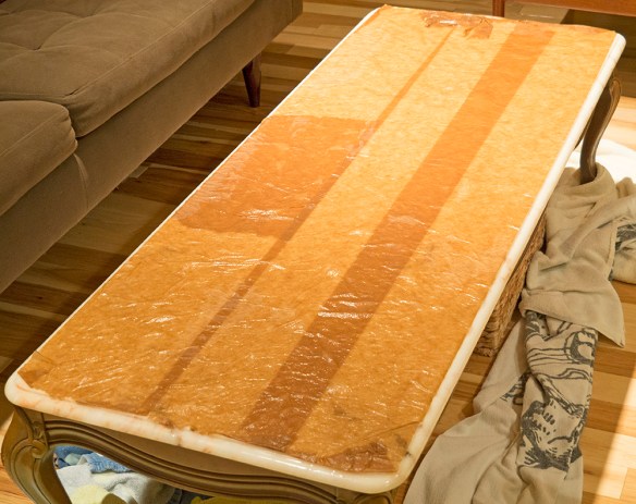 I have a marble-topped coffee table. It came to me a year or so ago with water-rings etched into its polished surface. I did the DIY thing, and ordered the stuff to polish the marble. It wasn’t easy but it mostly worked and I was happy. Then, over the holidays, I spilled a whiskey-honey-lemon juice concoction* on it. Deep sigh. It left a big, white mark.