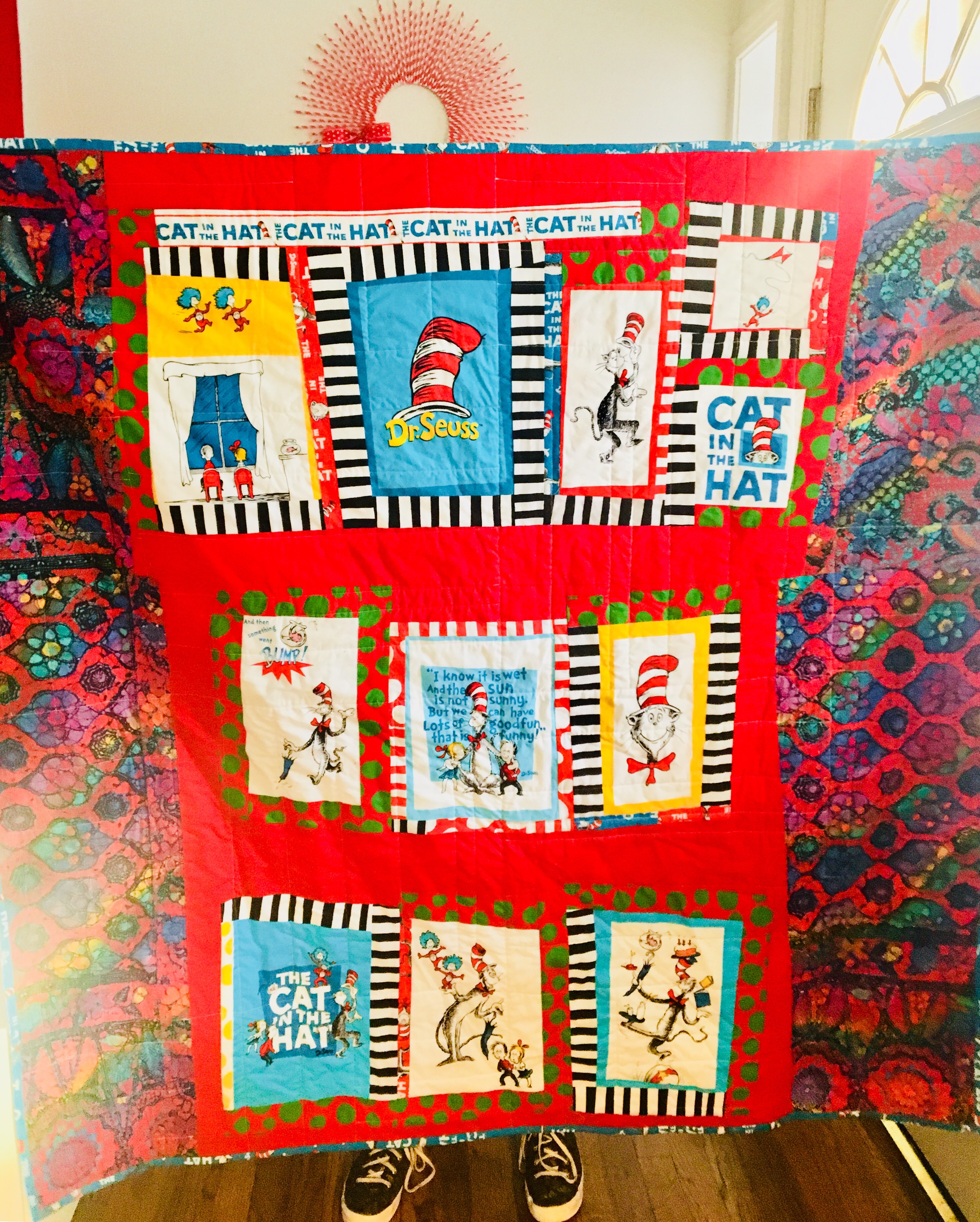 Your quilt back makes me smile. And the picture with the tennis shoes showing under the quilt is very “Seussian”, like they belong attached to the quilt.