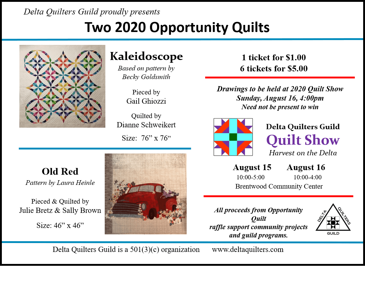 Matching the points of the bird body units so that the four point stars that touched were the same fabric was quite a feat. Lots of brainery and patience was required. LOL.  I am attaching two photos of the quilt itself; on the design wall and at its first showing, which was at a Quilt in the Garden affair. I am also attaching the flyer for our Opportunity quilts for the 2020 year.