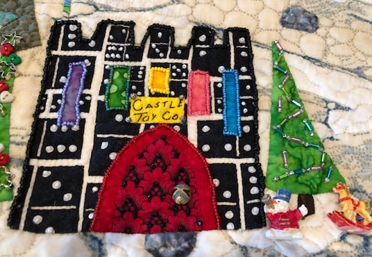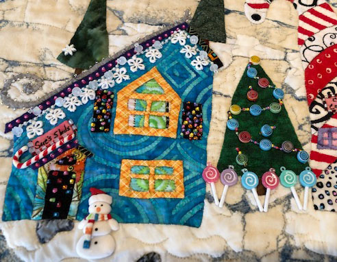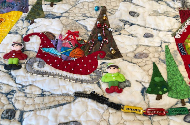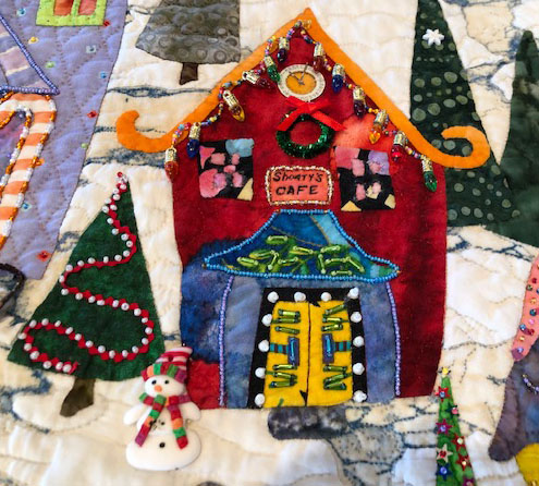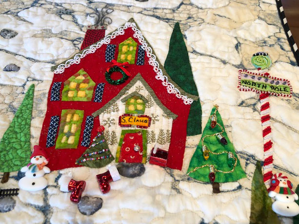 Diane Pfeifley wrote to say: “After I made Whoville for my niece, I decided that I wanted a Santa village for myself. It’s all needle turn appliqué, hand quilted, and embellished to death. I searched and collected fun, little things for several years. Then I decided to try beading. I hadn’t done any beading before. Well, if a little beading is good… a lot of beading is better! I’ve had so much fun using your North Pole patterns. Thanks for a wonderfully fun bunch of patterns.”