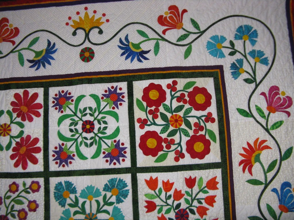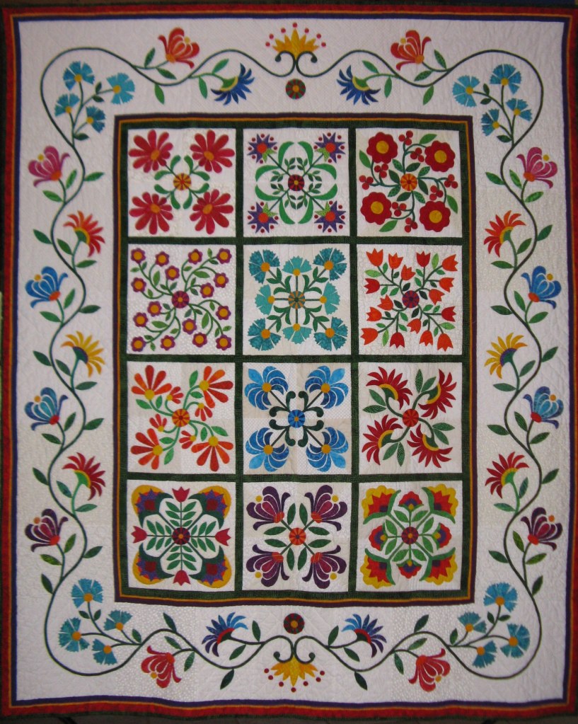 Jeanne Brenner sent me photos of the quilt made by members of Quilters Limited in Tallahassee for their opportunity quilt for the annual Capital City Quilt Show. The quilt show theme is Jazz It up, so they named ours Jazzy Garden. It is hand appliqued by many of quilters who took my class students, and it is hand quilted.