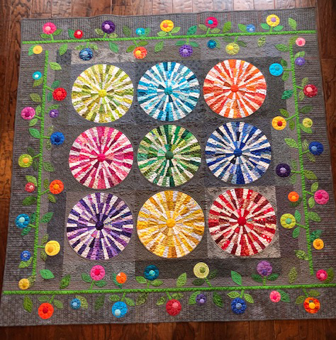 1. Susan has a very colorful and beautifully quilted quilt! Thanks for sharing your work with us. I’m really liking each color wheel done in one color. And your border of pretty flowers just makes the wheels pop off the top!