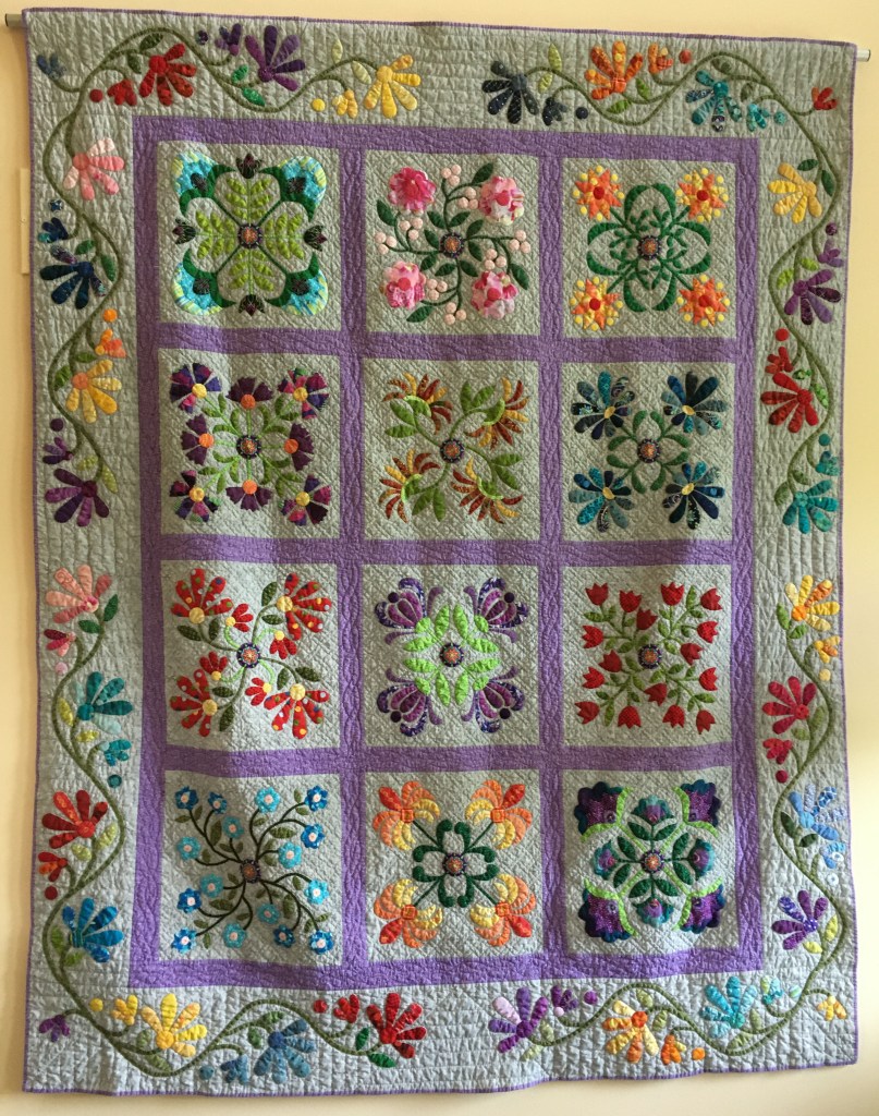 Mary Hubbard from Green Valley, AZ, saw our Whimsical Quilt Garden quilt on Pinterest, found the pattern, and made the her quilt. Isn’t it lovely! Mary worked on her quilt for about 7 to 9 months all hand appliquéd and hand quilted. She put on a different border that she saw somewhere online. I do love that border, it frames the blocks very well.