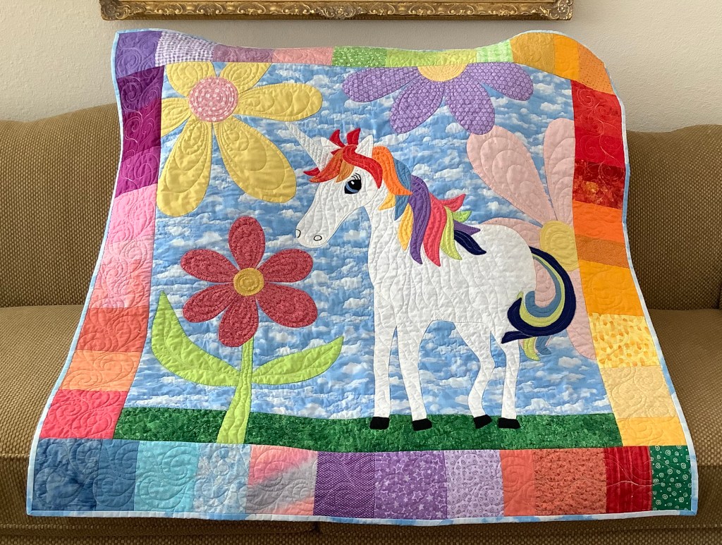 Margery wrote: “My long arm quilter was so enamored she took a picture and sent it to a friend who promptly bought the pattern! But who could NOT love everything Designed by Becky! The quilt will be a Christmas present for a special 4 yr old girl and know she will be thrilled especially since unicorns are her “thing” right now.”