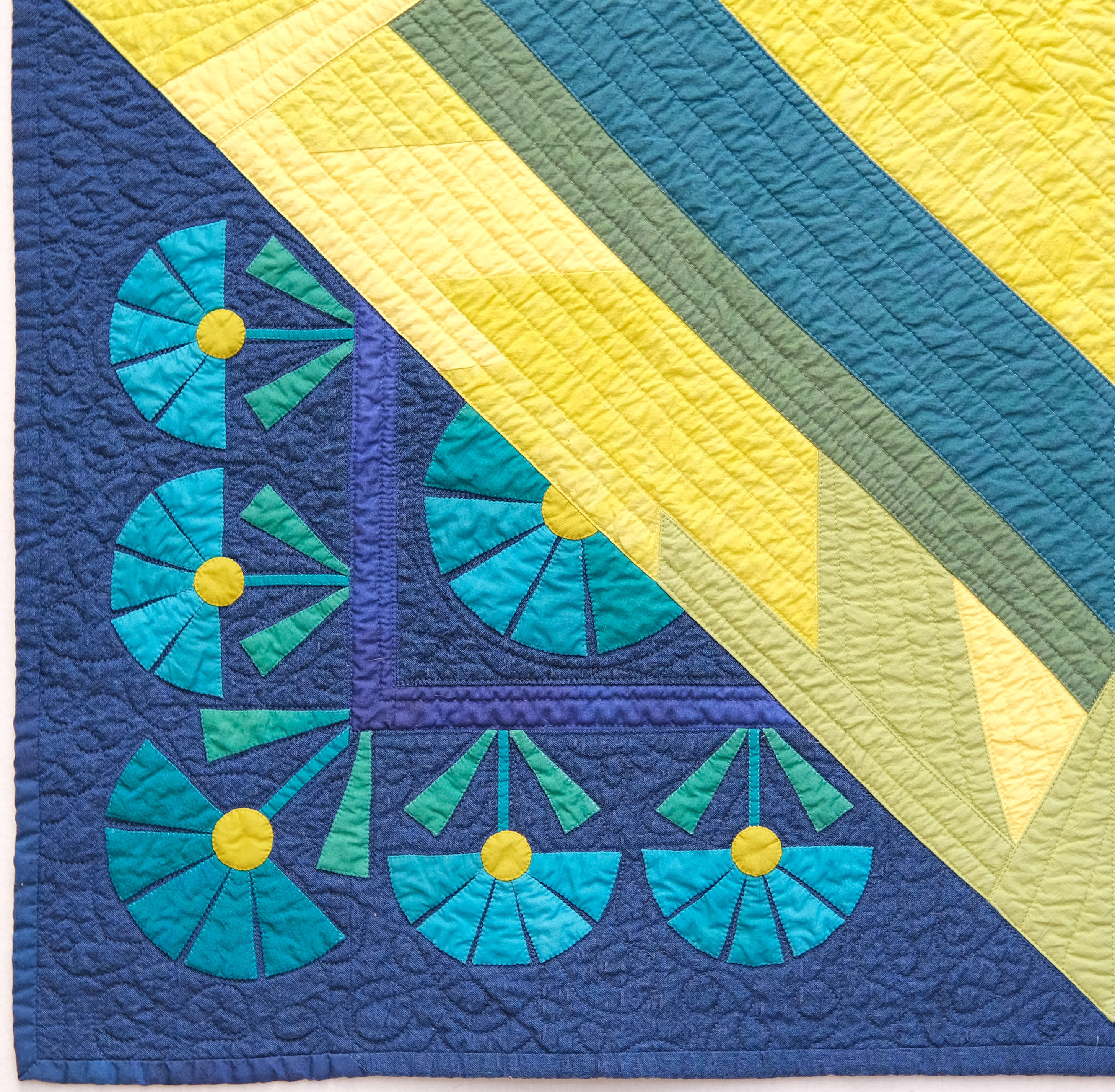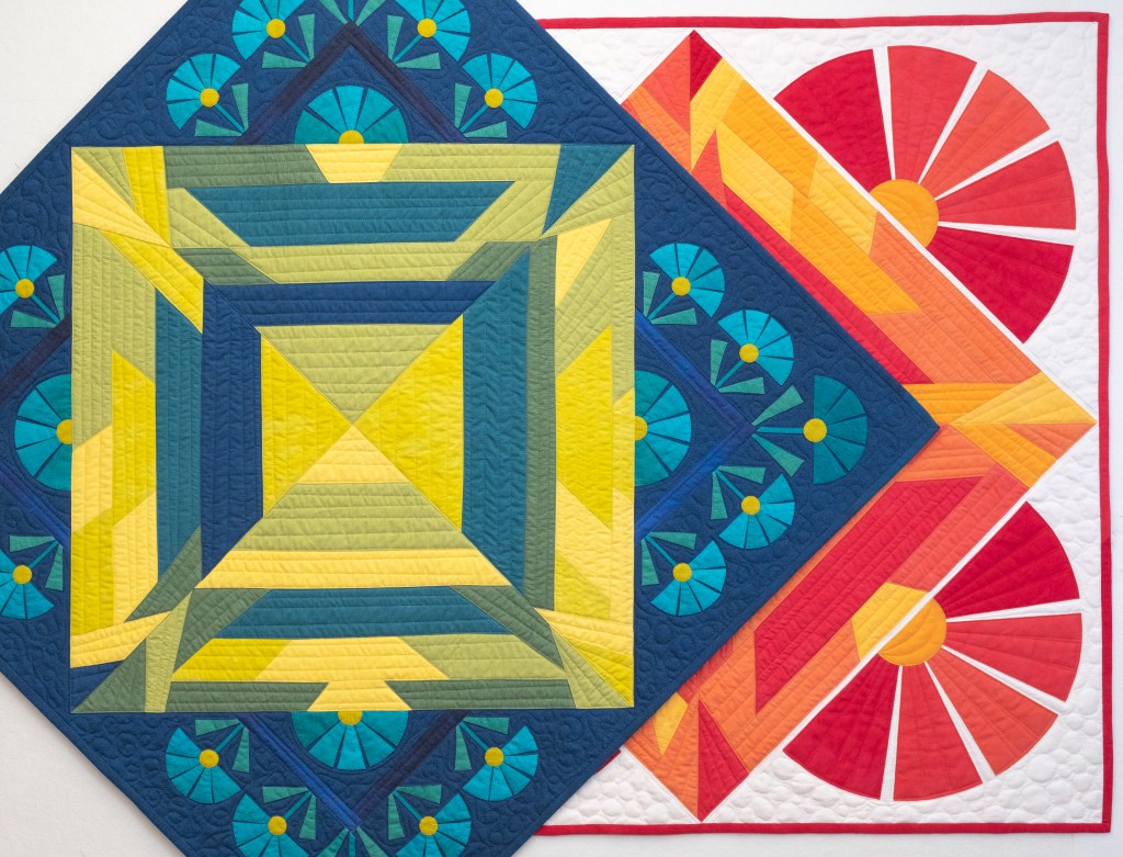 Do you remember the two Spring Bling quilts I made for my class with MJ Kinman? The one on the left has turned-edge machine appliqué and I used glue to hold the seam allowances in place. I used SoftFuse for the large raw-edge applique shapes in the quilt on the right.