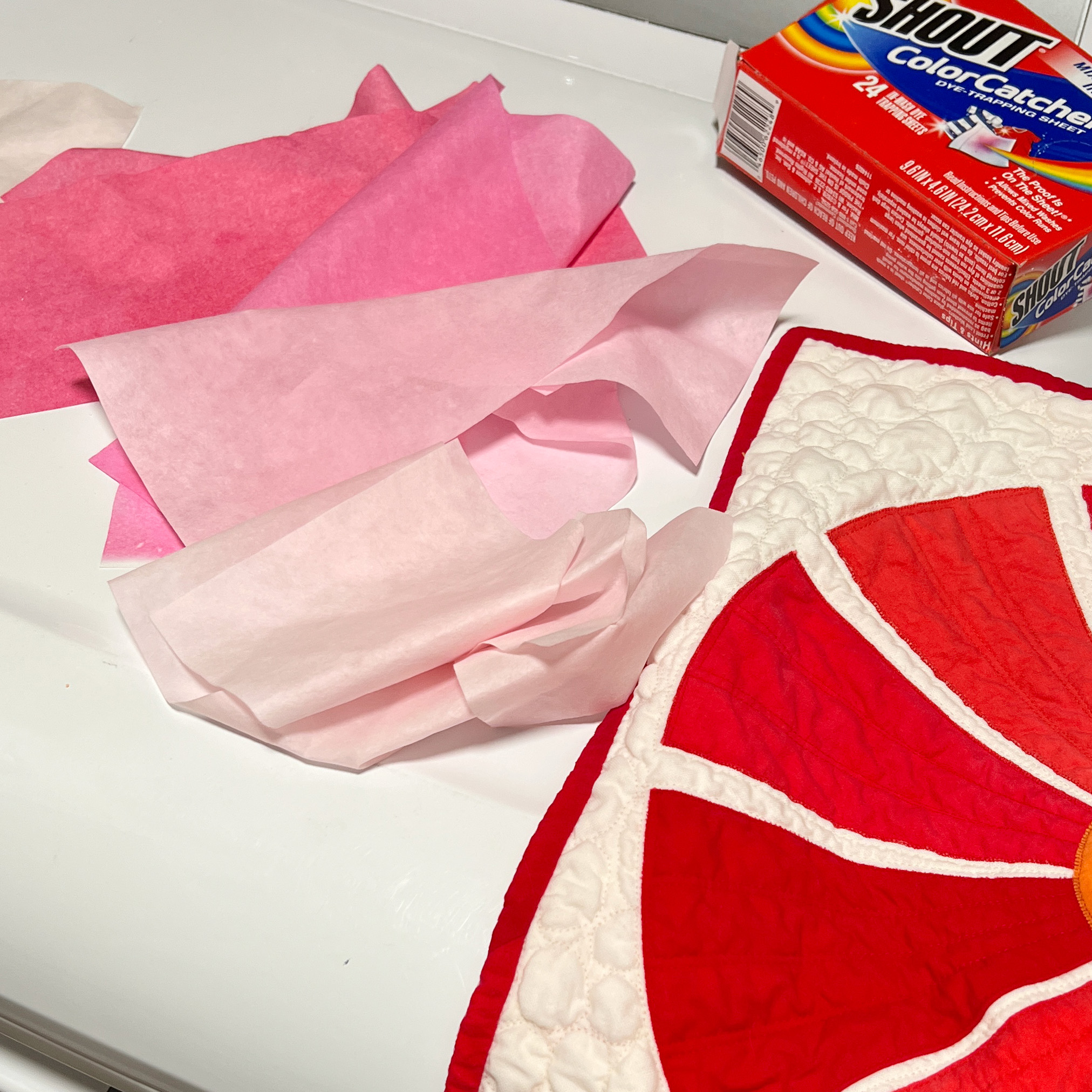 Wash #2: 2 Color Catchers, plus 1 TBLS Orvus Paste and 3 teaspoons of Synthrapol mixed in water, added to the washer, washing in hot water. The dark pink you see in the photo above, right, is one of the Color Catchers. I moved on to washes #3, #4, and #5 using the same washing products in hot water—the white fabric got cleaner with each wash.