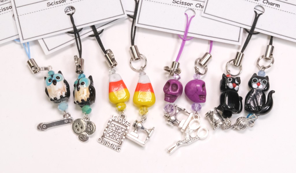 And Halloween scissor charms! Just tell us in the comments when you place your order: Purple Skull, Candycorn, Black Cats, or Owls. (If you need a witch or a pumpkin we can special order for you.)
