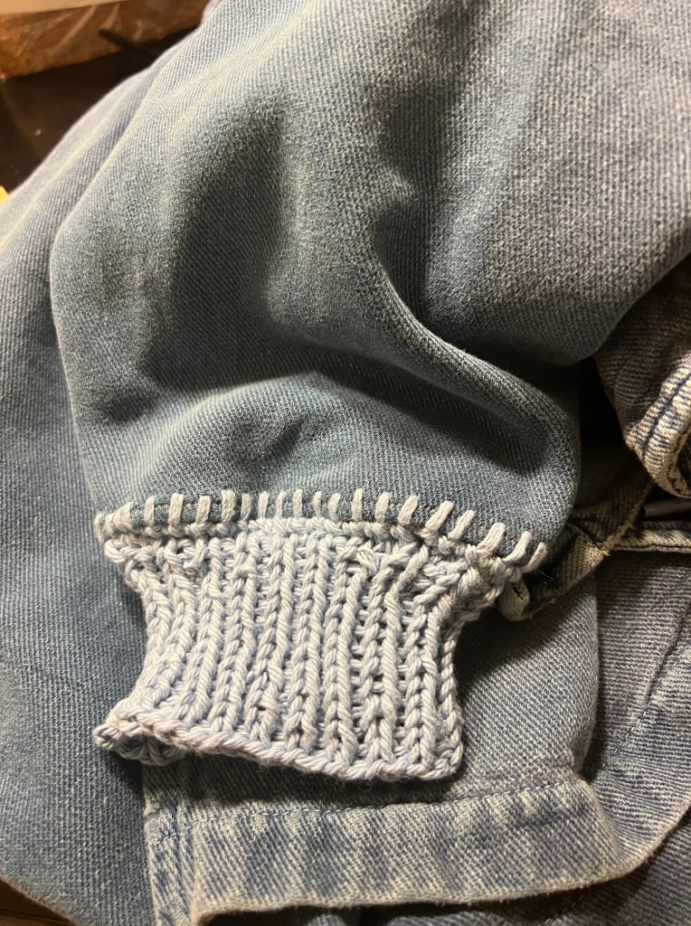 Yesterday I decided to save one. So I cut the sleeve off over the hole above the cuff. Then I added a small piece of interfacing to strengthen and serged the edge so it wouldn’t ravel, did a single turn hem and machine stitched it. I bought a sturdy cotton yarn, and did a button hole stitch and then a single crochet so it was nice and sturdy. I picked up stitches onto double pointed needles and knit a new cuff onto it. Cotton yarn is not particularly nice to work with but I knew it would hold up well.