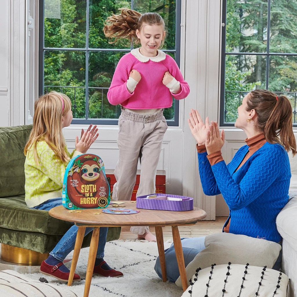 Sloth in a Hurry is an extra-hilarious version of charades. This fast moving improv game is eeBoo’s current best seller.