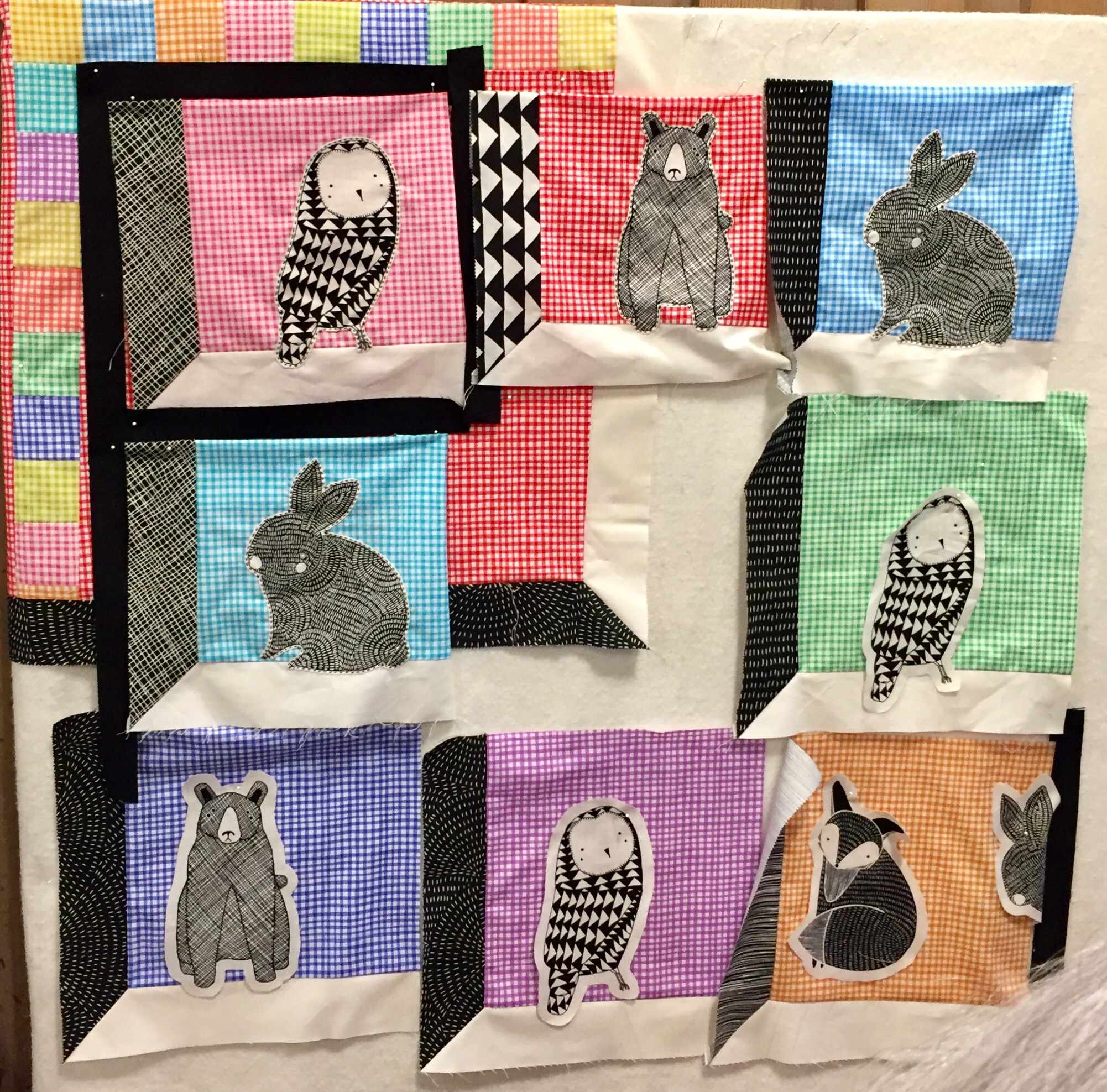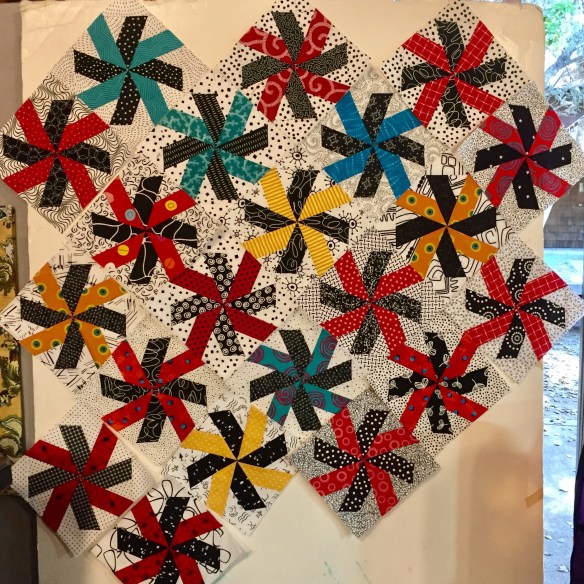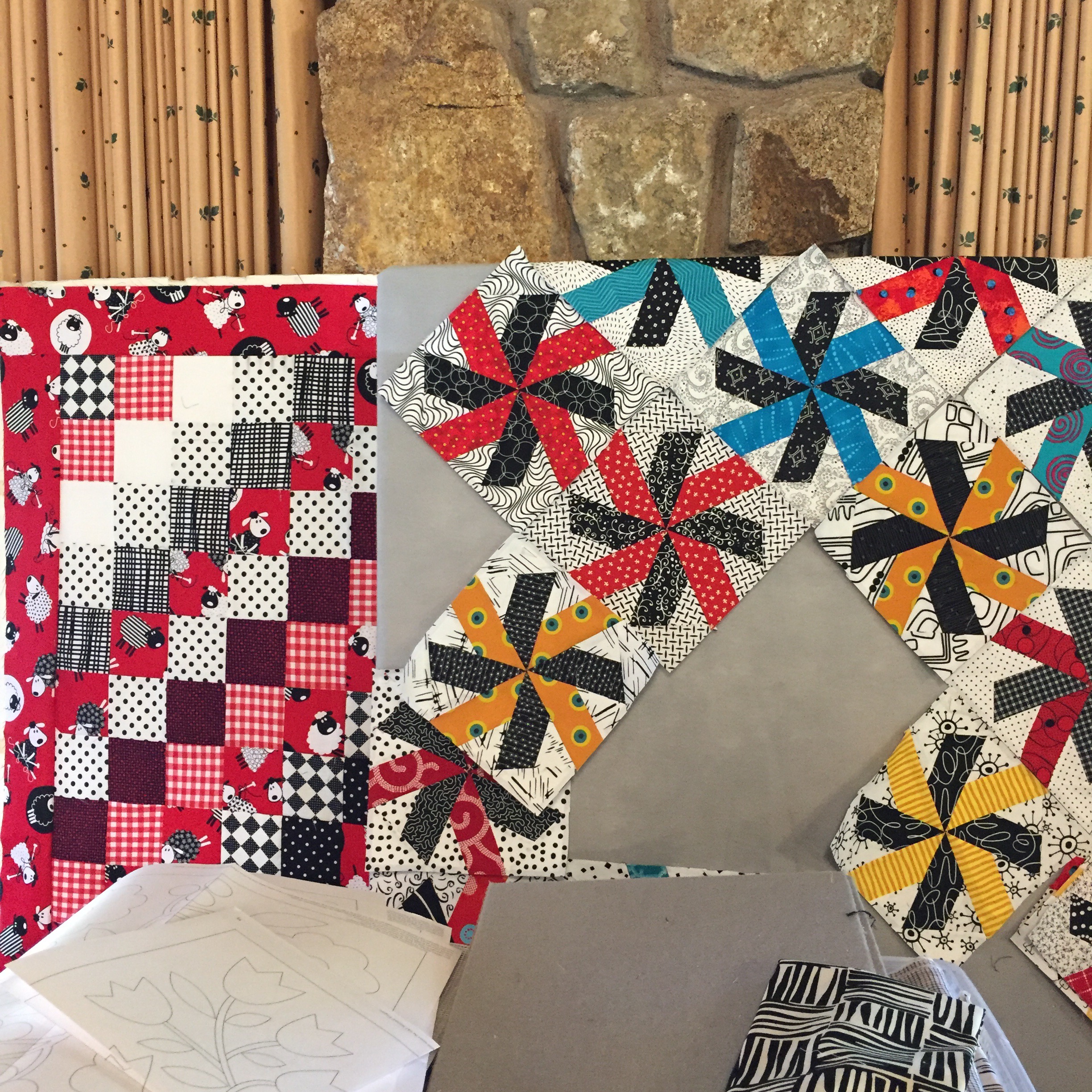 Louise made the foundation paper pieced blocks all week and worked right up to the last minute to get them ready to together.