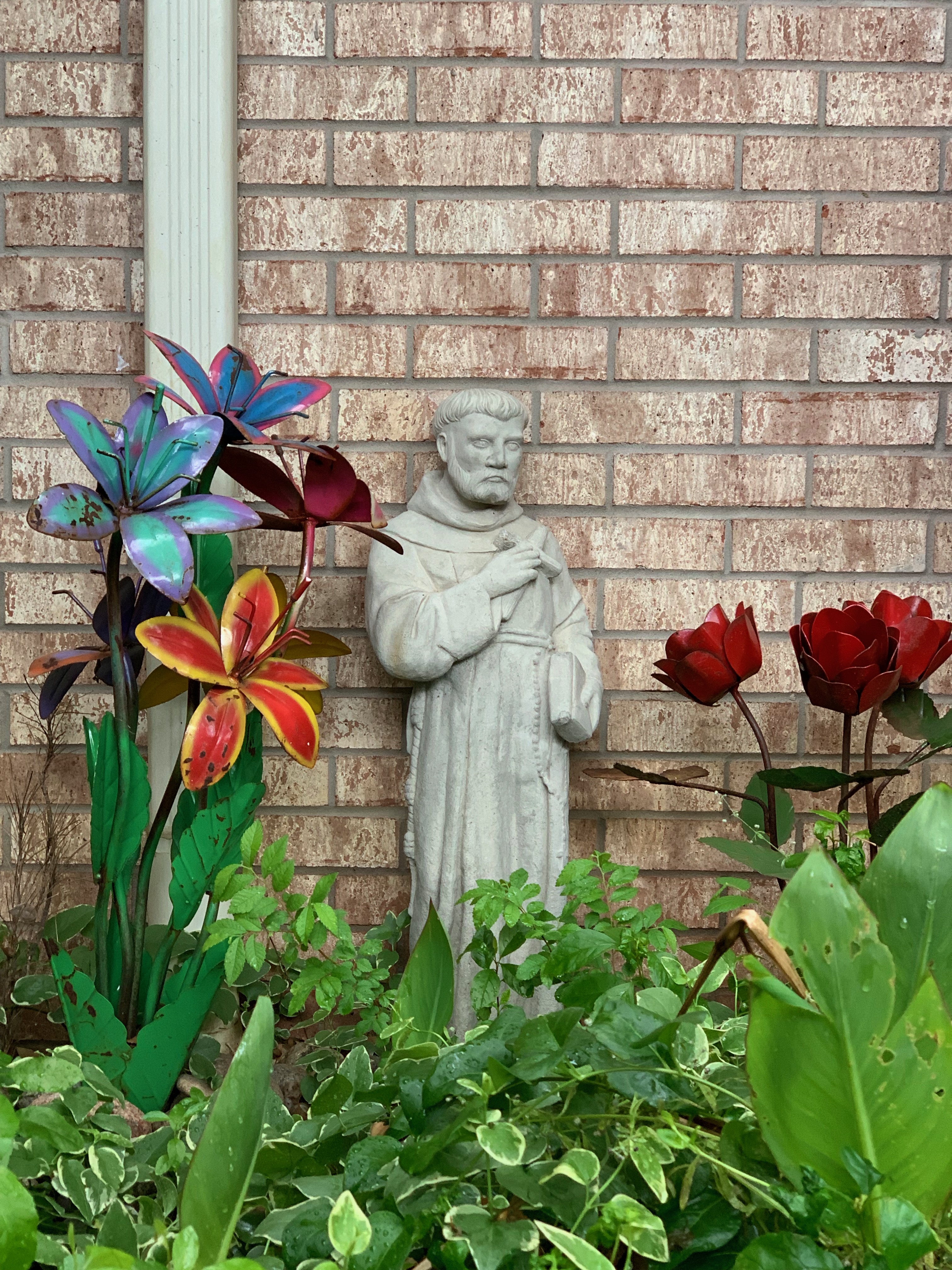 While I was at Preston Place delivering the cake, I visited the courtyard to see my mom’s St Francis statue ‘display’. I’ll never forget setting this up, with Steve and I moving St. Francis here and there, and putting the metal flowers in just the right place. Mom loved the metal flowers. I thought they were a little over the top but I have to admit that they are smile inducing.