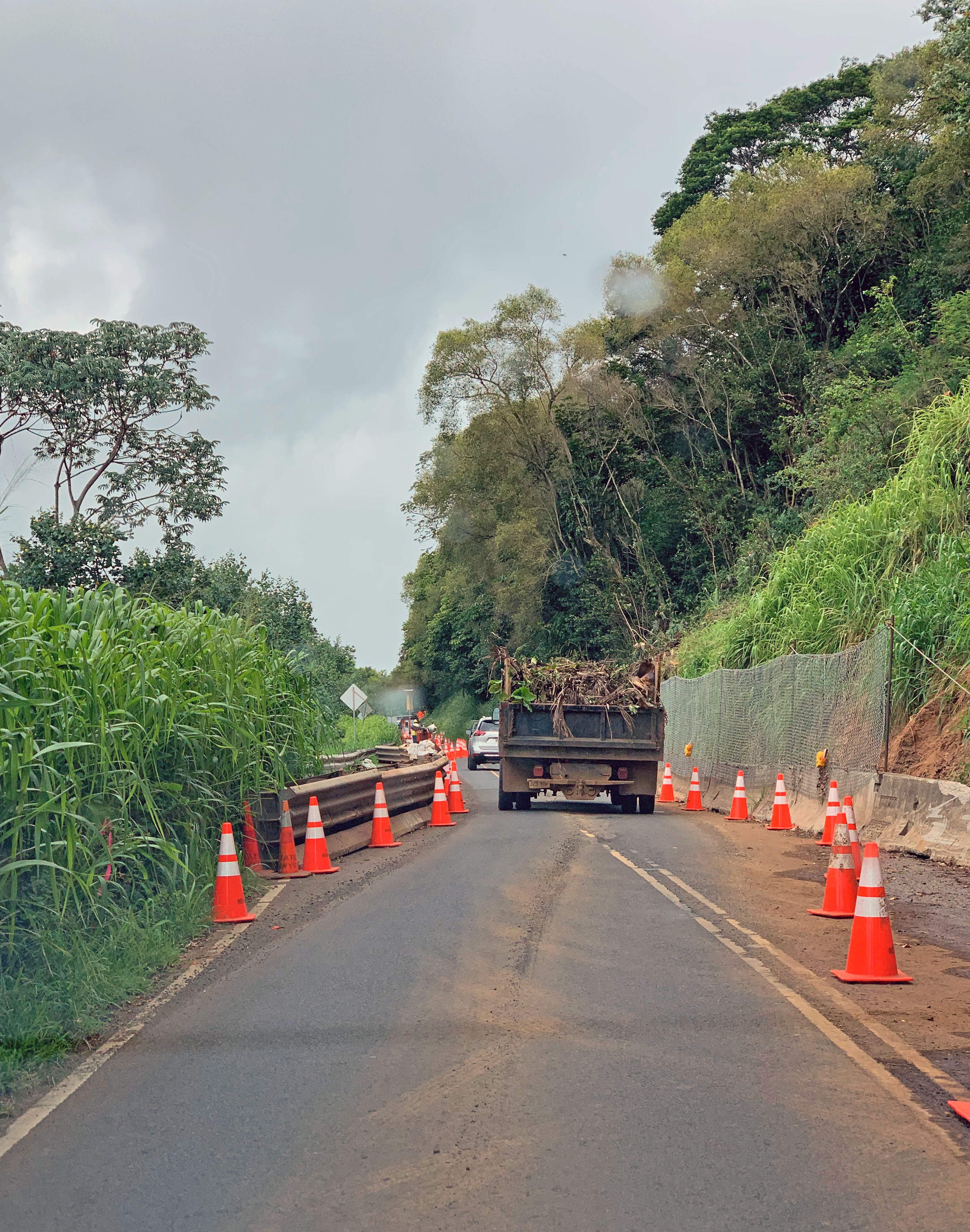 The road on the north side of Kauai hugs the slopes in many places. This is an island that gets a lot of rain and sometimes roads and bridges wash out. This is a spot on the 2 mile stretch of road between Princeville (where we stayed) and Hanalei (where we went pretty often). One of the lanes is mostly gone, washed way down the slope. It’s a long drop. Traffic is cut to one lane.