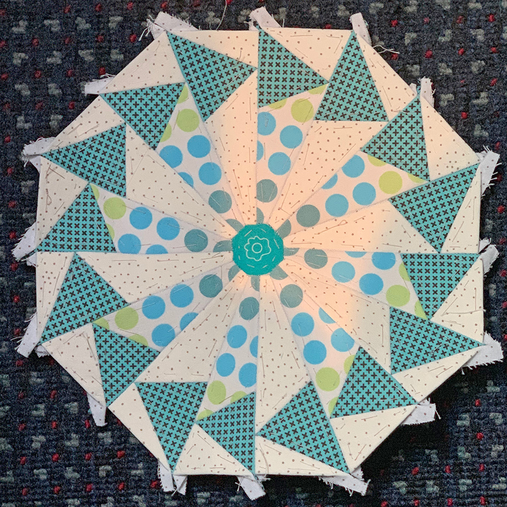 This is my Block 1, finished on the plane home from Italy. (That’s airplane carpet, not fabric, under the block.)