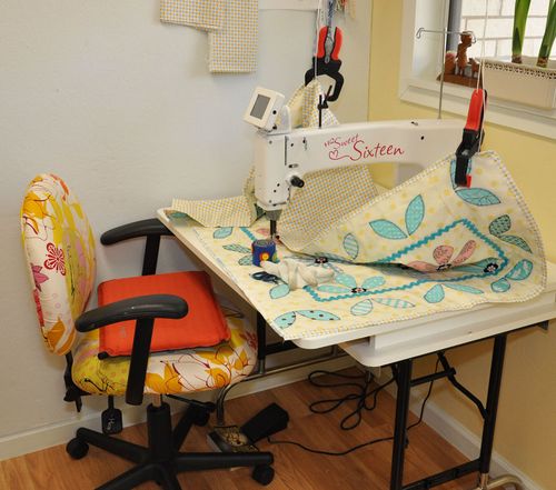 I first got the idea from Caryl Fallert-Gentry. Here she is at her machine: