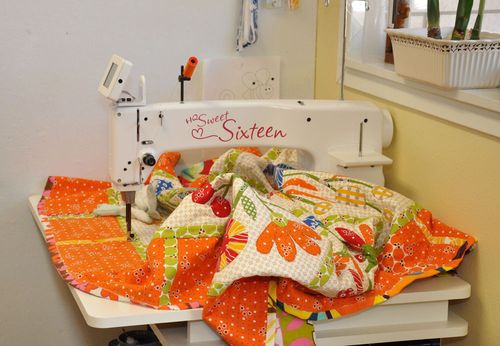 In the photo below I don’t have the clamps attached to the quilt. The weight of the quilt is on the table and hanging ove the edge. It is harder to manage.