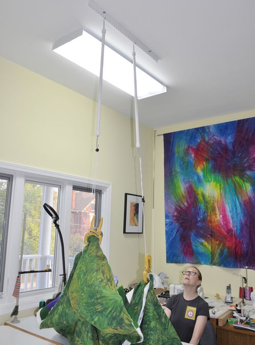 The idea is to use two quick-release clamps suspended from the ceiling to hold the weight of the quilt off of the table while you work. Her studio ceiling is very high so she added two metal poles with hooks on either end. I have 8′ ceilings so did not need the poles.