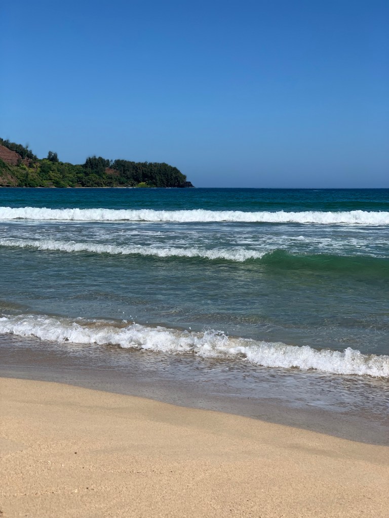 We decided to go to a beach that’s off the beaten path, Pu’u Poa beach. If you are staying at the Princeville Resort, there is an elevator that takes you down the cliff. Public access requires climbing down a steep path.