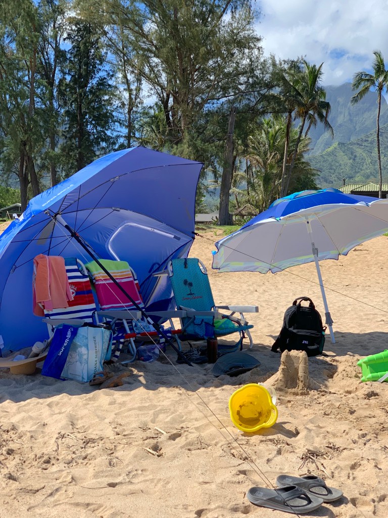 We set up two umbrella structures! The one on the left is ours, from Walmart in Lihue. The condo came stocked with the chairs and smaller umbrella…