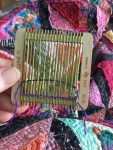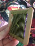 I decided to just use #3 perle cotton thread (including some Painters Perles) for the loom. The squares are pretty fast to put together, and you can create different looks by switching up the colors, the size of the thread, maybe using wool thread. I made a couple of “tiny rugs” with fringe using the instructions from Jack’s (my 10-year-old) wee weaver. Here’s a picture story I made for you: