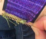 After a few tries at finger tying the knots in the fringe, I thought of using the eye of a needle. I grabbed a chenille needle that I’d been using in the weaving (from the assorted pack by Tulip) with a big eye, and it worked perfectly. Varied chenille needles worked for sewing/embroidering the squares to the wool, and later the wool to the yazzii.